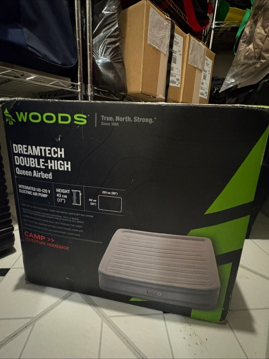 Selling a Woods Dreamtech Double-High Queen Airbed! It comes with an integrated 110-120V electric air pump for quick and easy inflation. The box is included.