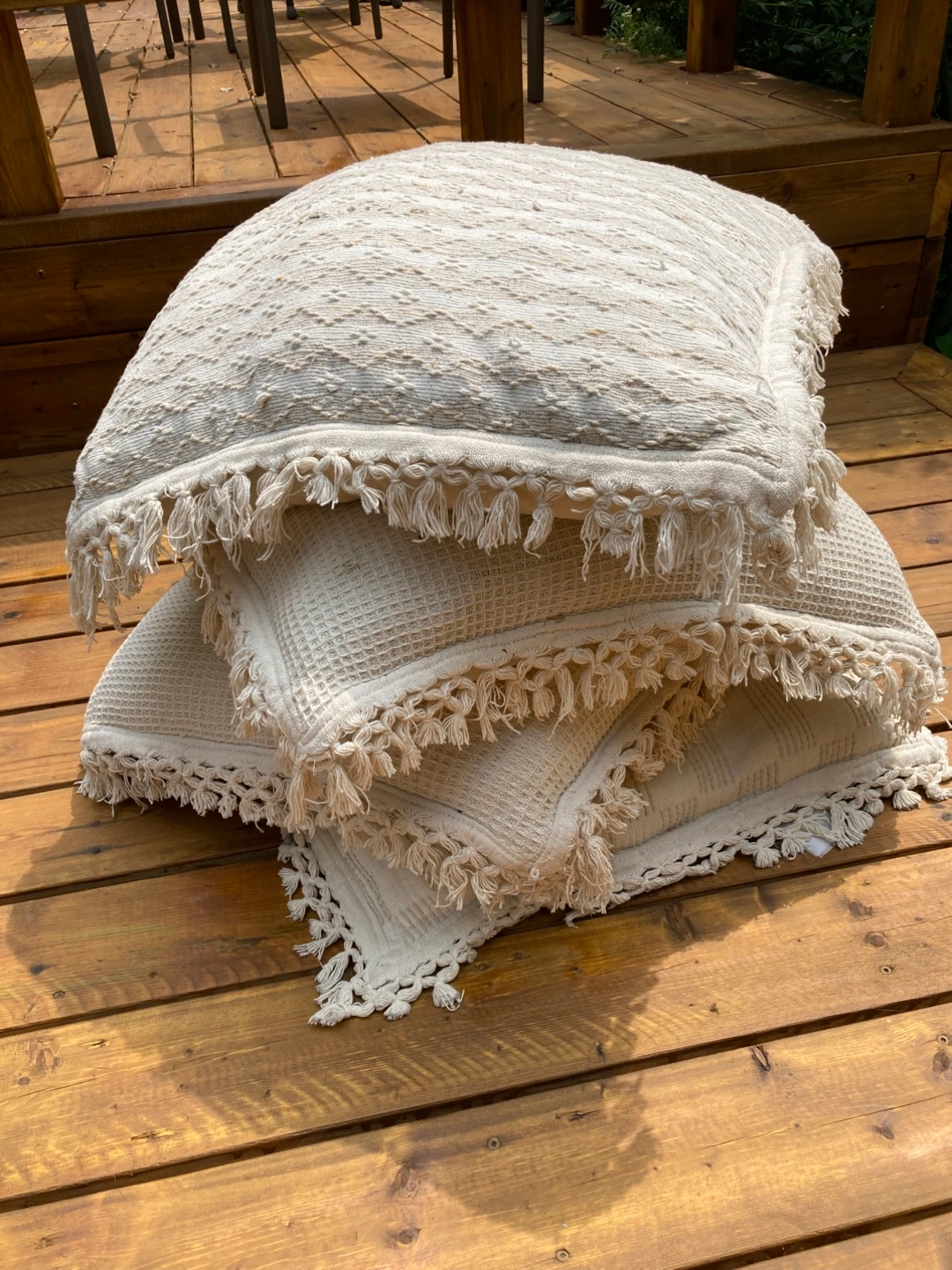 Selling four decorative throw pillows made from 100% woven cotton, with fringe trim and neutral colours. Two have a striped pattern and two have a waffle texture. They're perfect for adding a cozy touch to any room, and due to their size can be used for sitting on the floor at a party or other gathering when there aren’t enough chairs in the house…. Take one or all. You can also see new covers to match your decor!