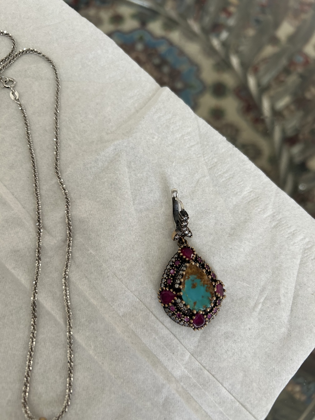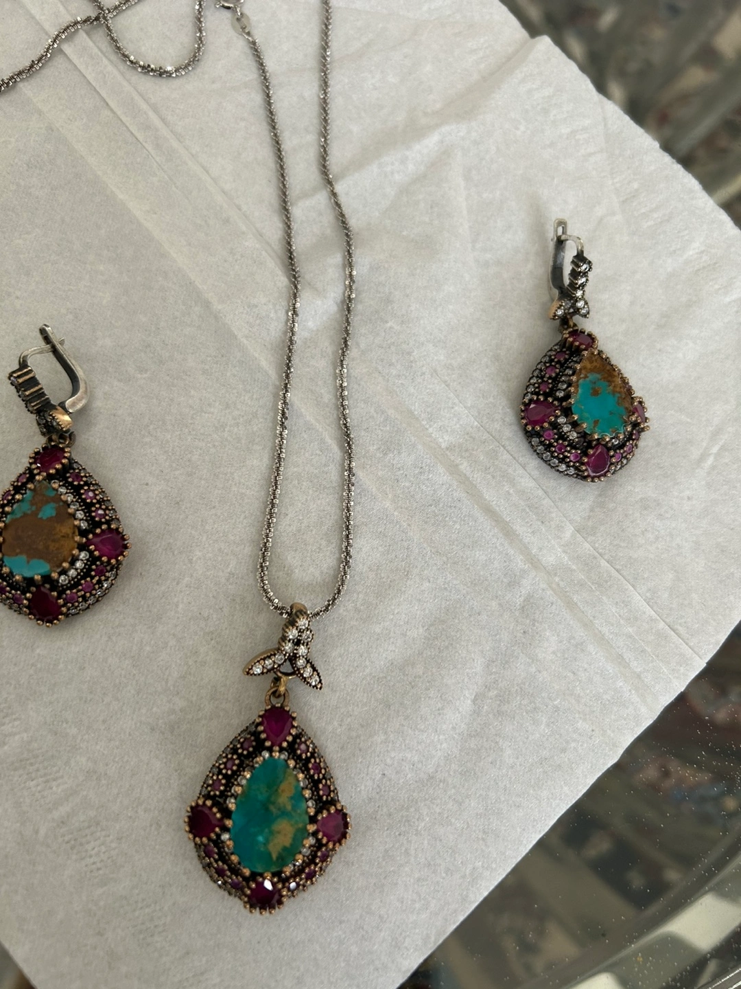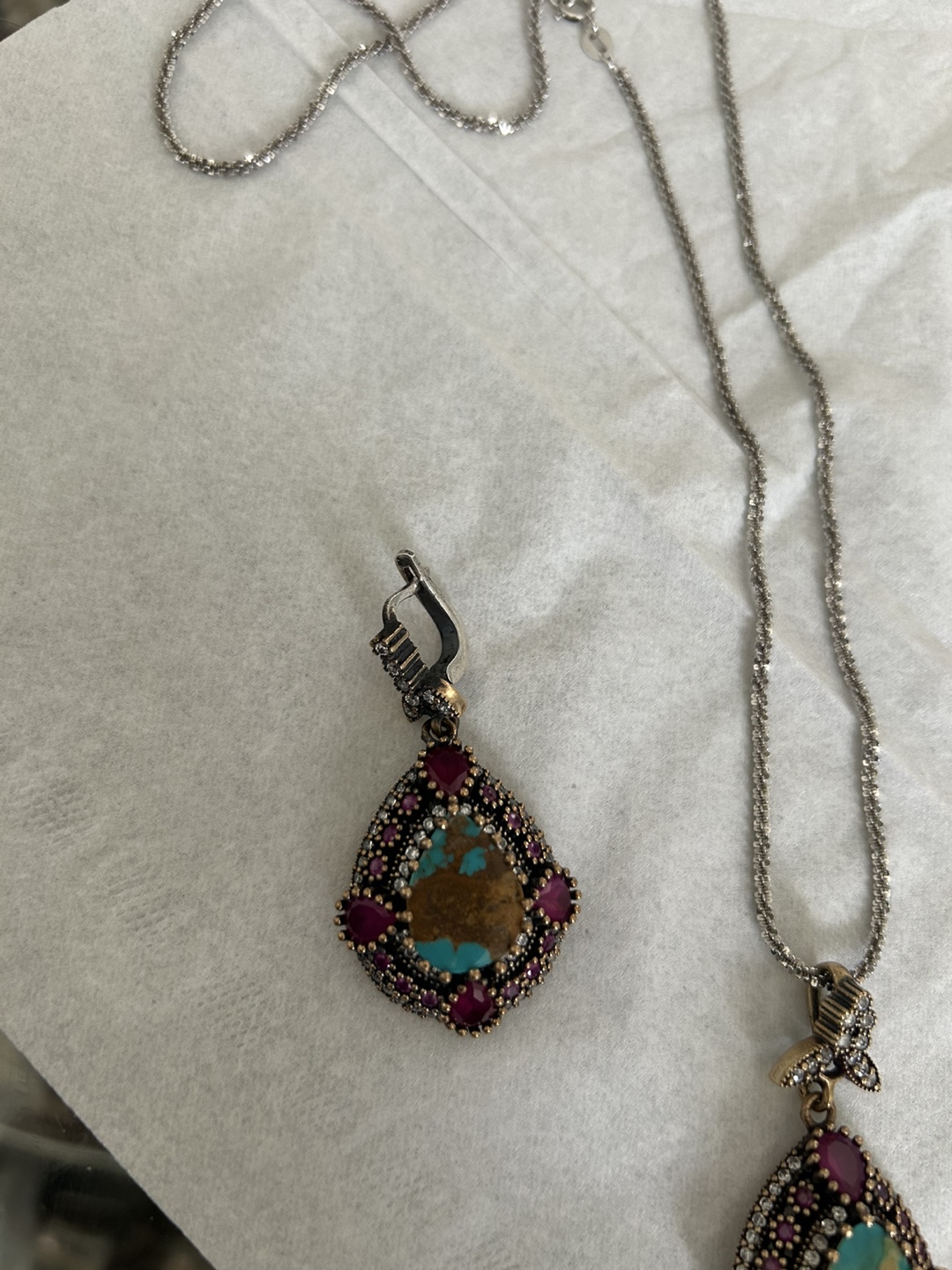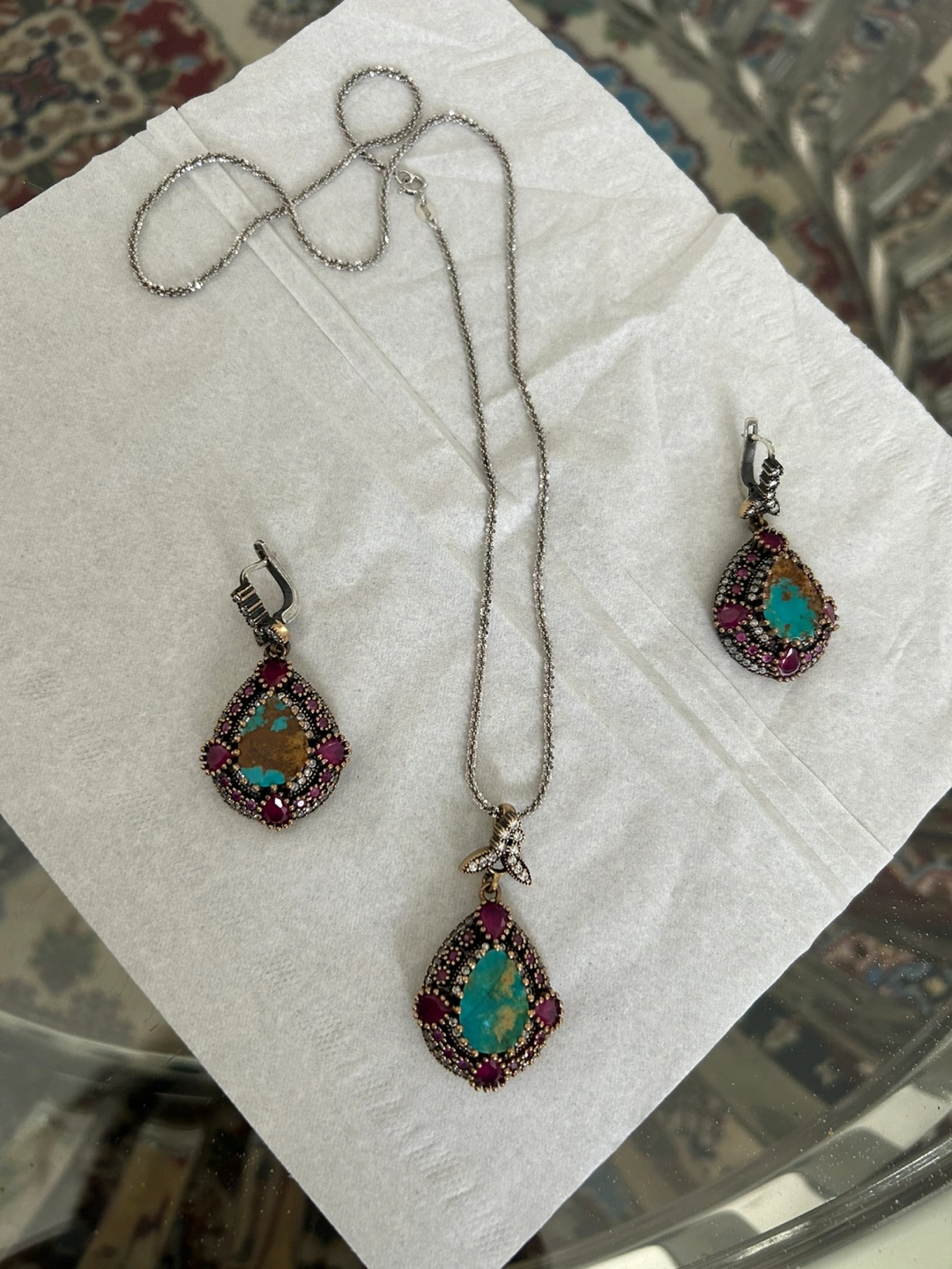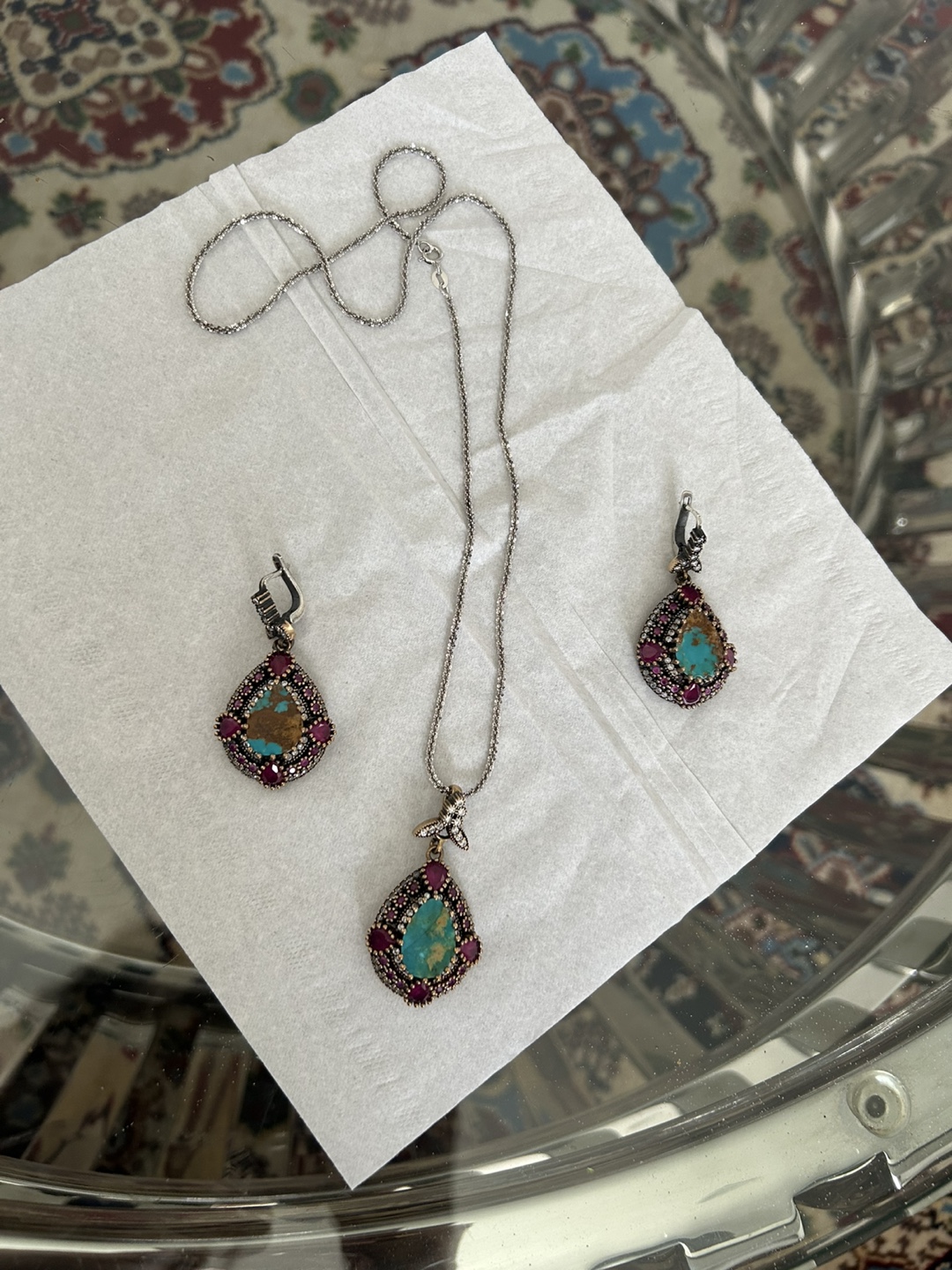 Beautiful matching necklace and earrings set featuring turquoise stones surrounded by red accents. The chain is a delicate silver colour. Perfect for adding a pop of colour to any outfit! It is 925 silver form Iran
