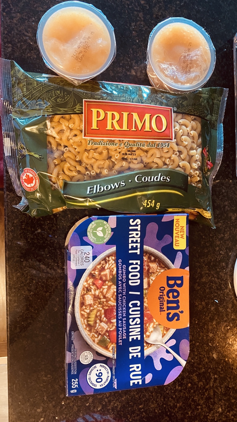 I have a package of Primo Elbows pasta, 454g, and a box of Ben's Original Street Food Gumbo with Chicken Sausage, 255g. Plus two containers of applesauce with a best before date of 2025 March 15