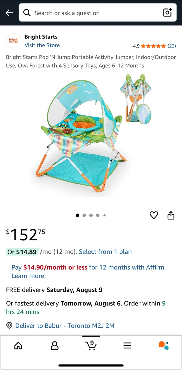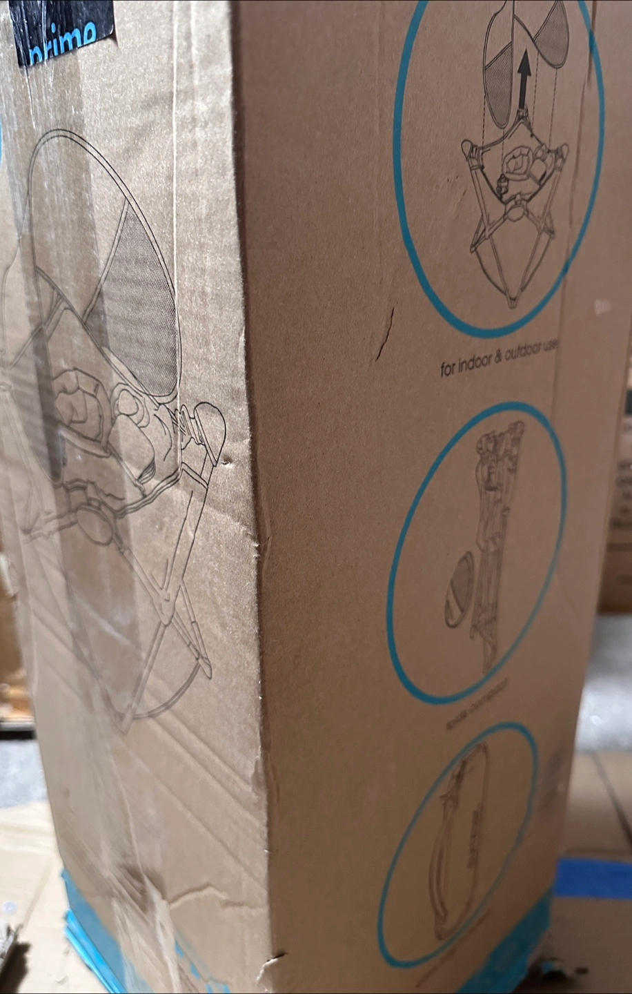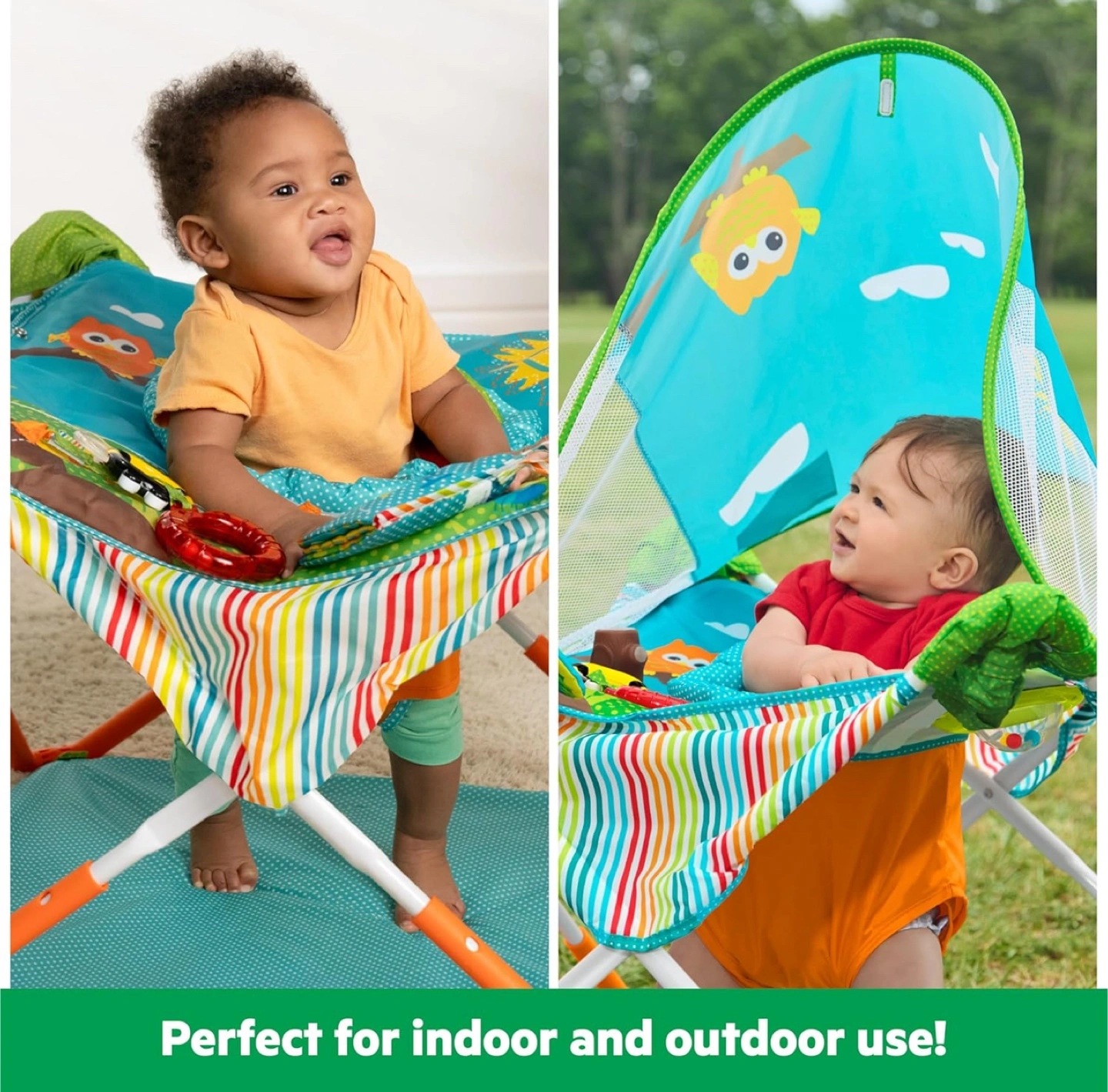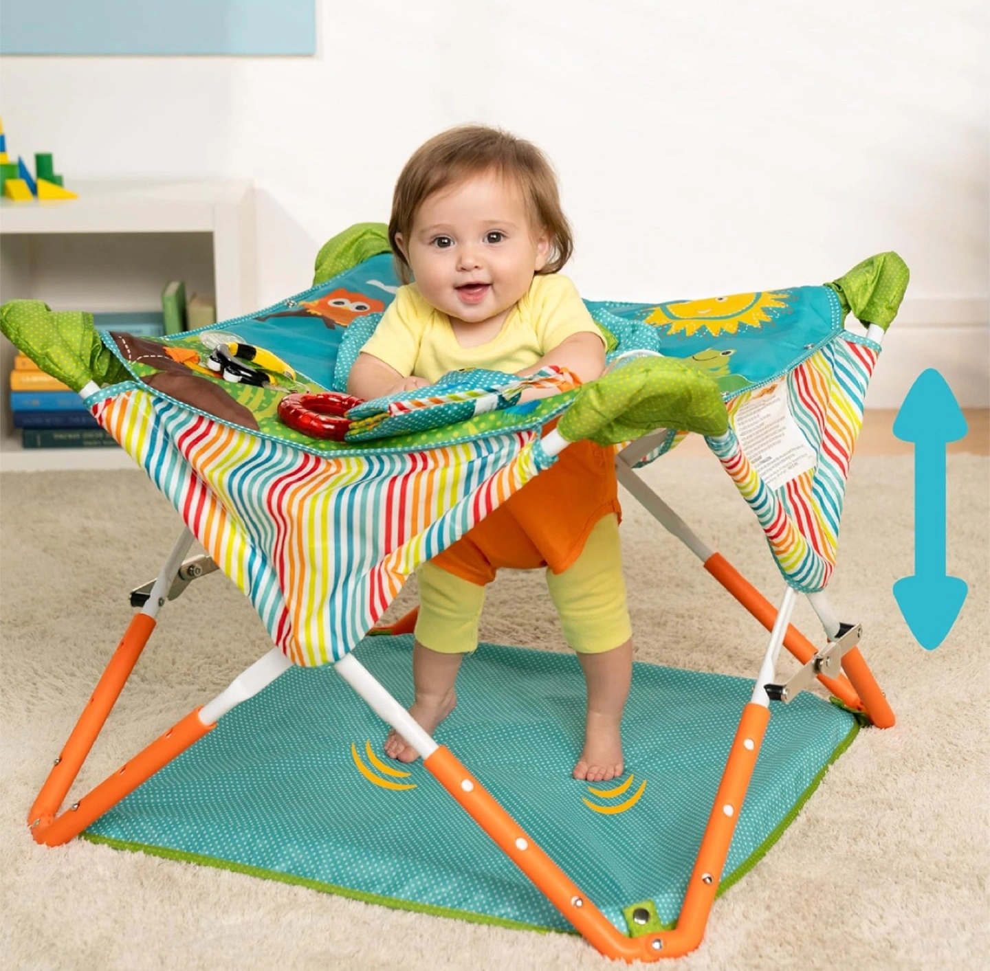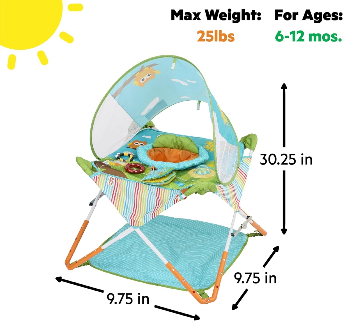 306Pop 'N Jump Portable Activity Jumper Both Indoor/Outdoor Use Height Adjustable Removable Canopy included for UV protection Sensory Toys included Ages 6-12 Months canopy NOTE: New in box, not used