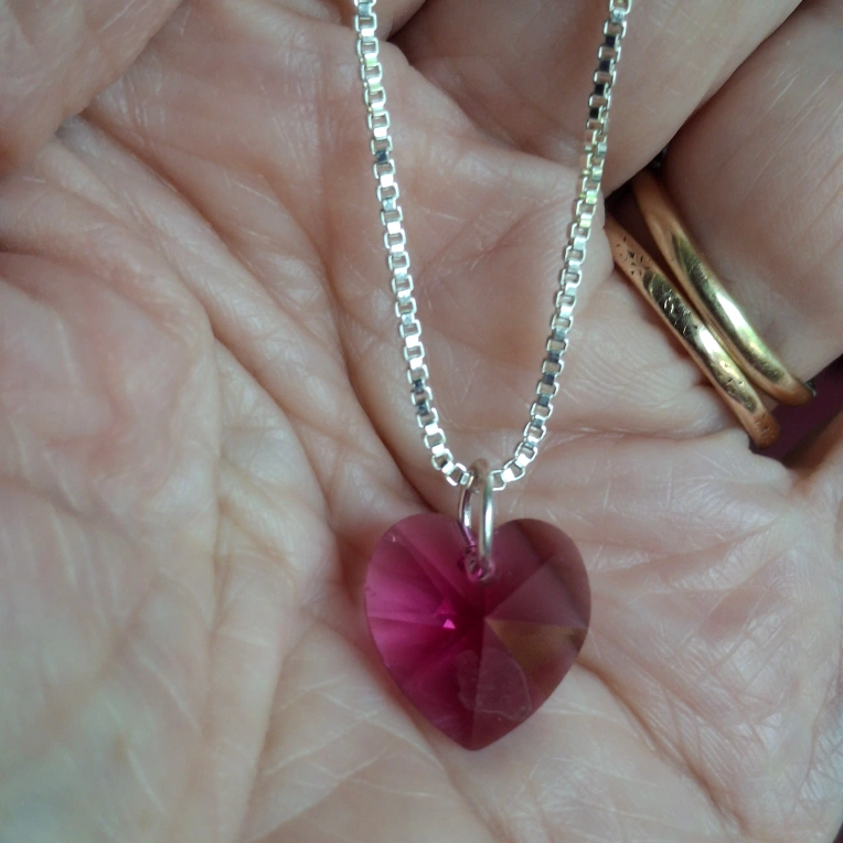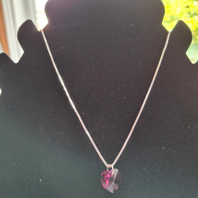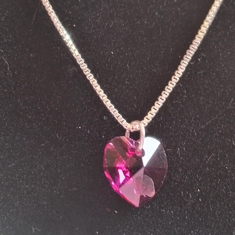 Selling a lovely heart pendant necklace. The pendant is a beautiful shade of pink and has a faceted design that catches the light nicely. The chain is a delicate sterling silver.