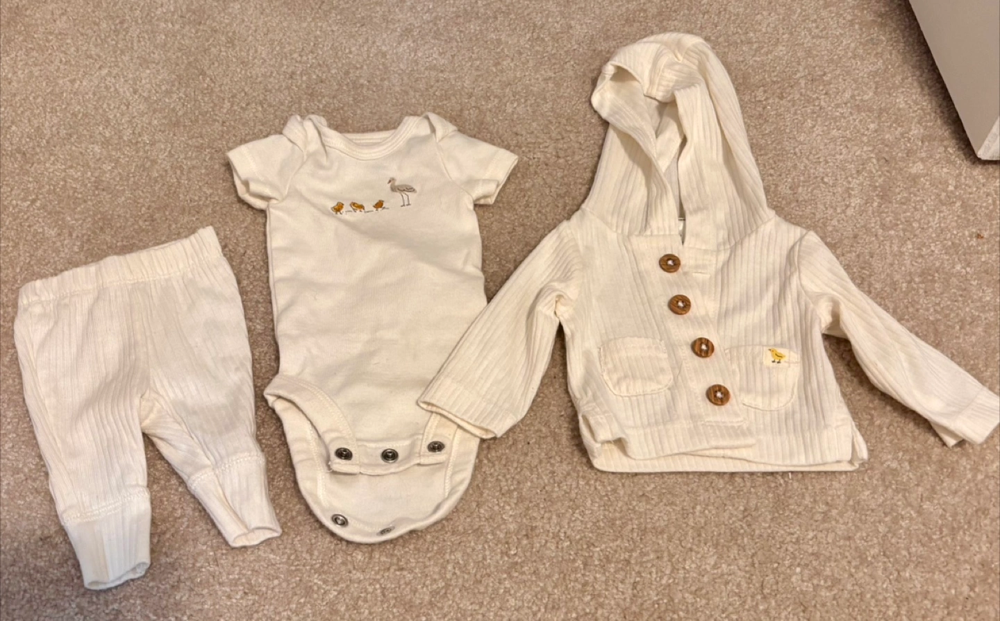 A sweet little outfit for your little one! This set includes a bodysuit with a cute bird design, matching pants, and a cardigan with wooden buttons. All in a soft, creamy white colour. Perfect for keeping your baby comfy and stylish! Premie size. Worn once for photoshoot.