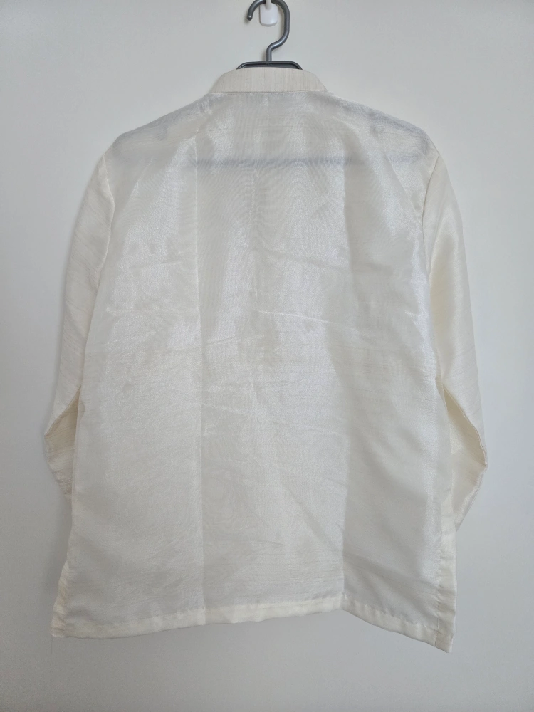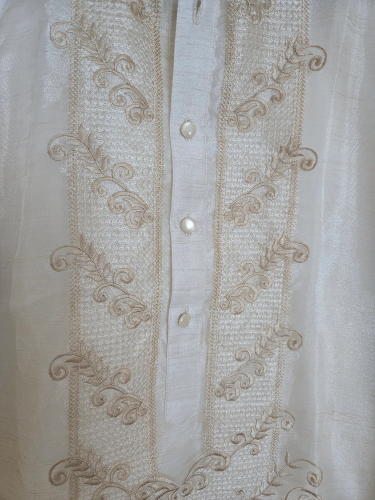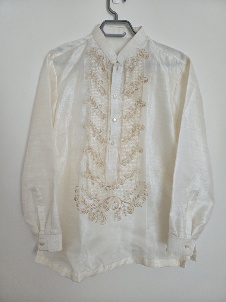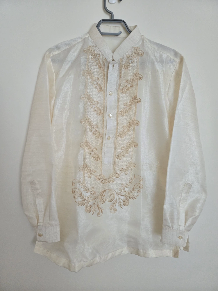 Selling a beautiful Men's Barong Tagalog, a traditional Filipino formal shirt. It's a light beige colour with intricate embroidery. Perfect for special occasions
