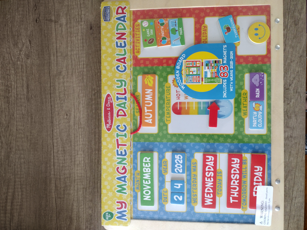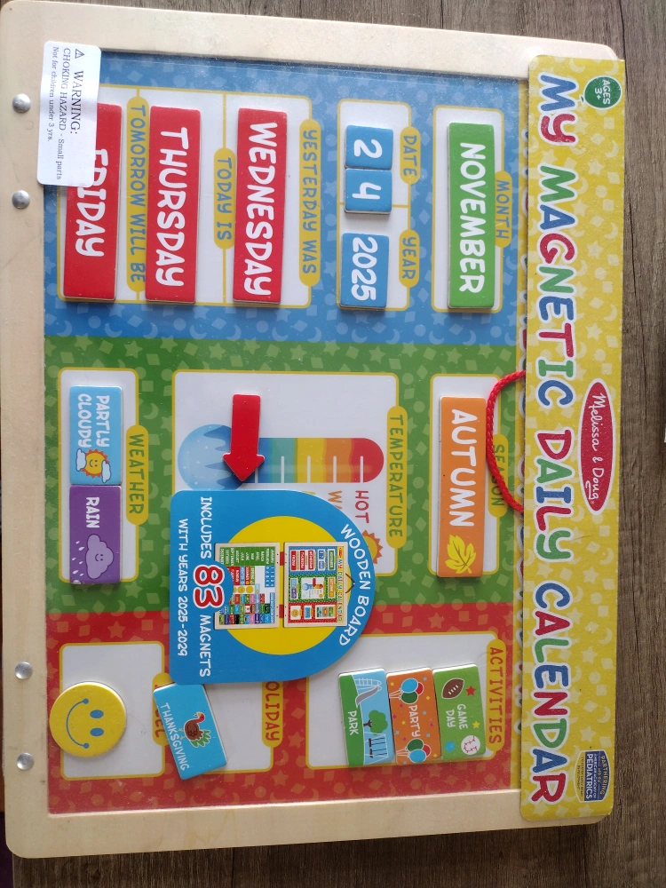 I'm selling a Melissa & Doug My Magnetic Daily Calendar! It includes 83 magnets with years 2025-2029. It's a fun and interactive way for kids to learn about the date, weather, season, and more