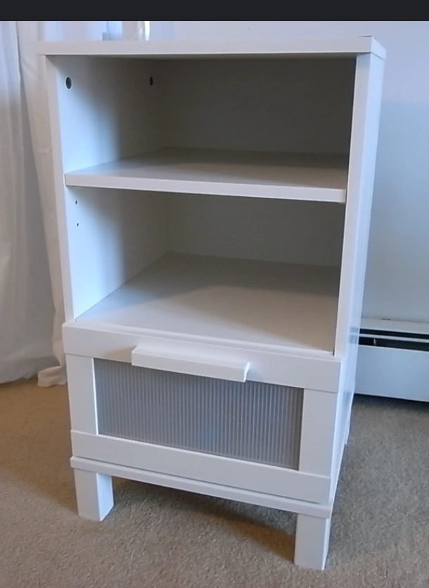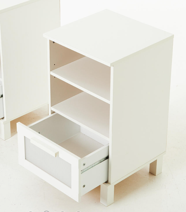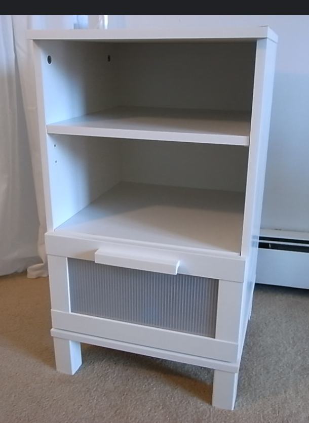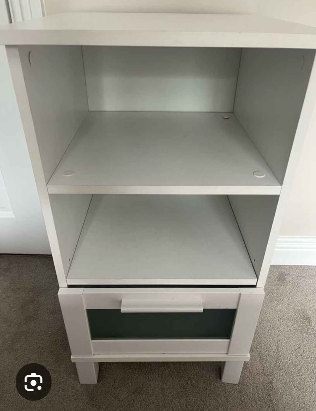 Selling a cute white shelf unit! It has two open shelves and a drawer at the bottom. Perfect for a small space or as a bedside table. It's in good condition, from a smoke/pest free home.
