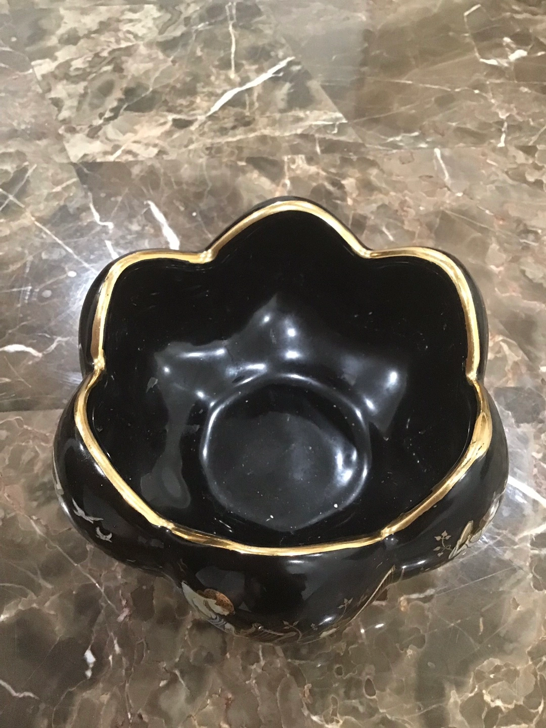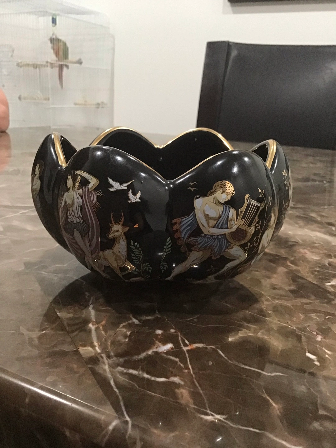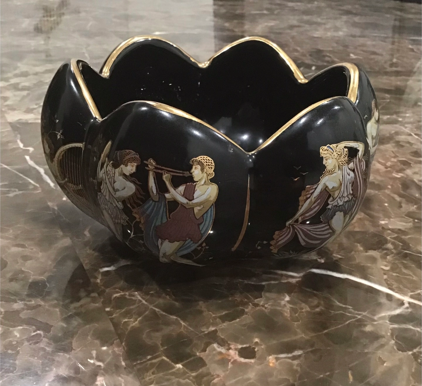 Selling a beautiful black decorative bowl. It features intricate Greek figures and a gold trim. Perfect for adding a touch of elegance to any room!