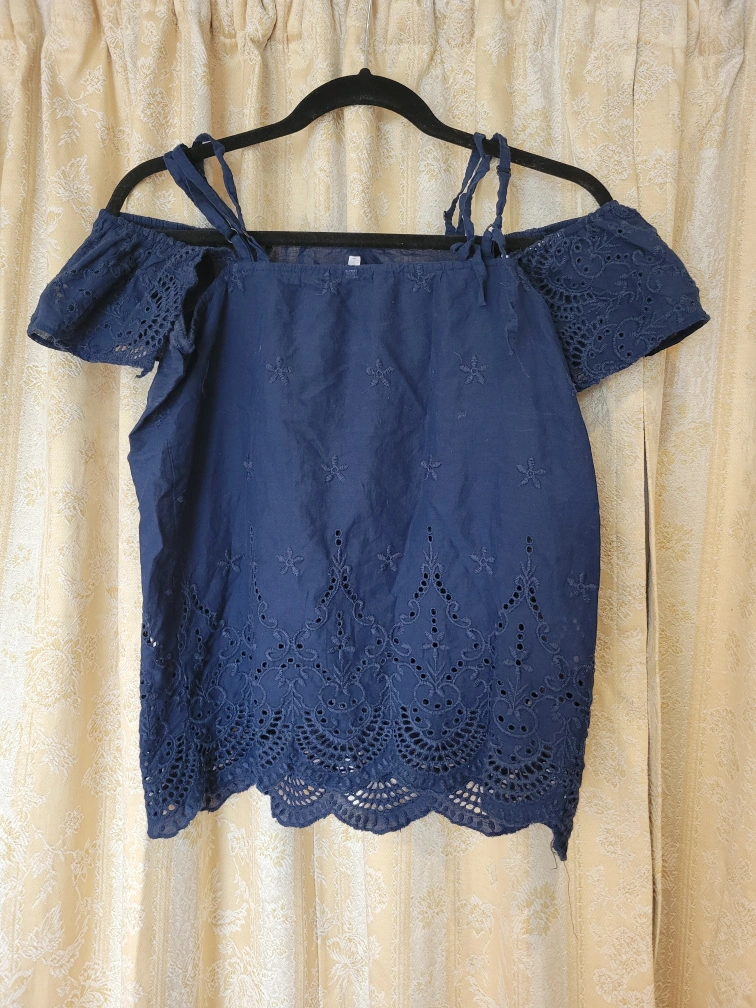 Here's a lovely navy blue blouse featuring an off-the-shoulder design with delicate embroidery detailing! It's perfect for adding a touch of elegance to your wardrobe. The material feels light and airy, making it super comfy for warmer weather