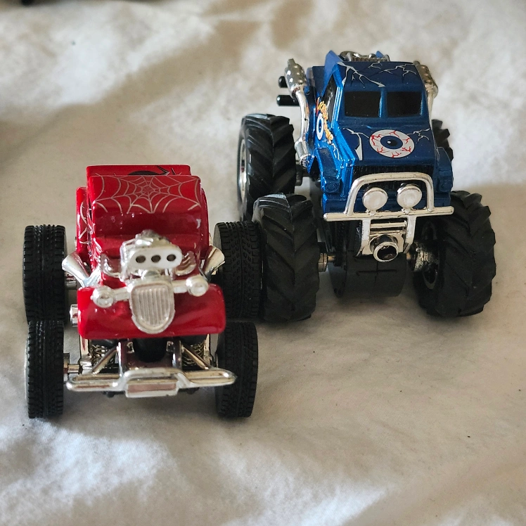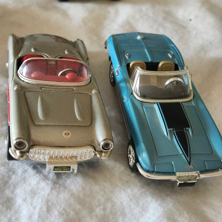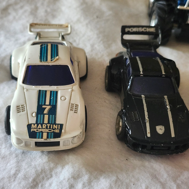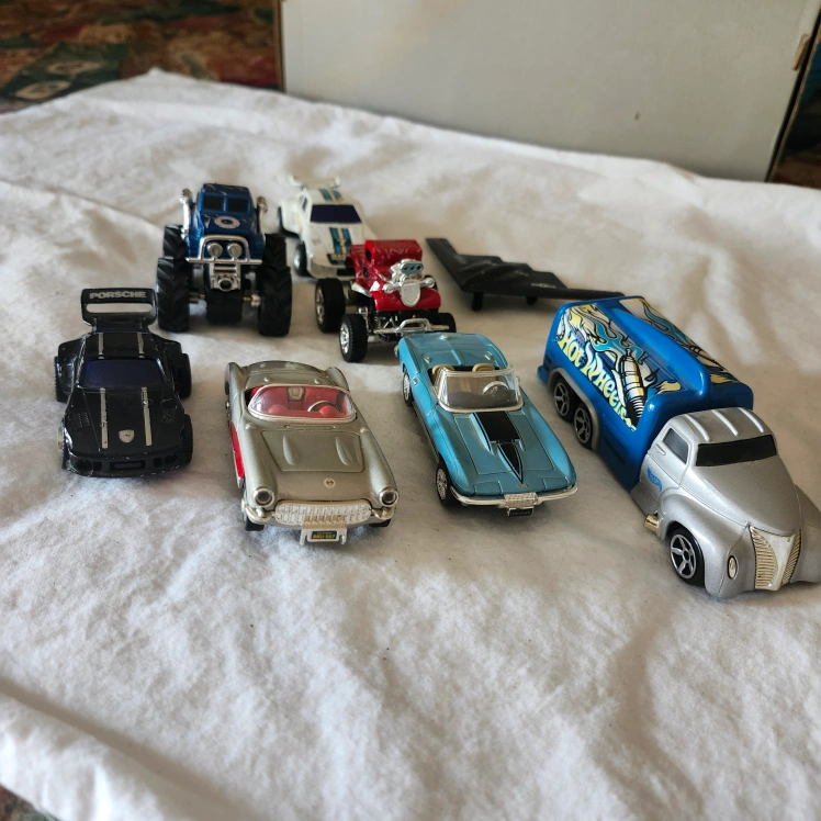 Selling a collection of toy cars! There's a Martini Porsche, a Corvette, and some monster trucks. Great for collectors or kids who love playing with cars. Pick up.
