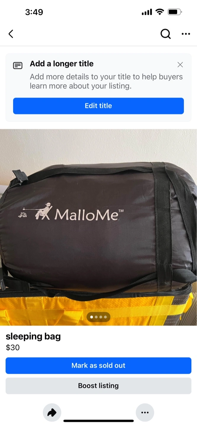 Buy & SellMalloMe Sleeping BagMalloMe Sleeping Bag$24Selling a MalloMe sleeping bag! It's in great condition and ready for your next camping trip or outdoor adventure newConditionNewWHERE TO MEET224-10 Jamaica Ave queens village ny 11428View MapSELLERNitaQueens Village352 reviews1 chats·1 favorites·15 viewsSEND CHAT TO SELLERHi Nita! I’m interested in your listing.Hi Nita! I’m interested in your listing.Get the Karrot app to chatSign In to chat