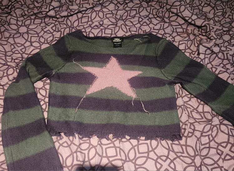 Selling a Social Collision sweater cropped from Hot Topic! It's a size L and made of 100% acrylic. The sweater has a striped pattern with a star design on the front. Perfect for adding a bit of edge to your wardrobe!