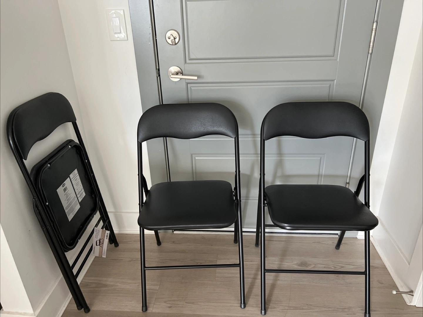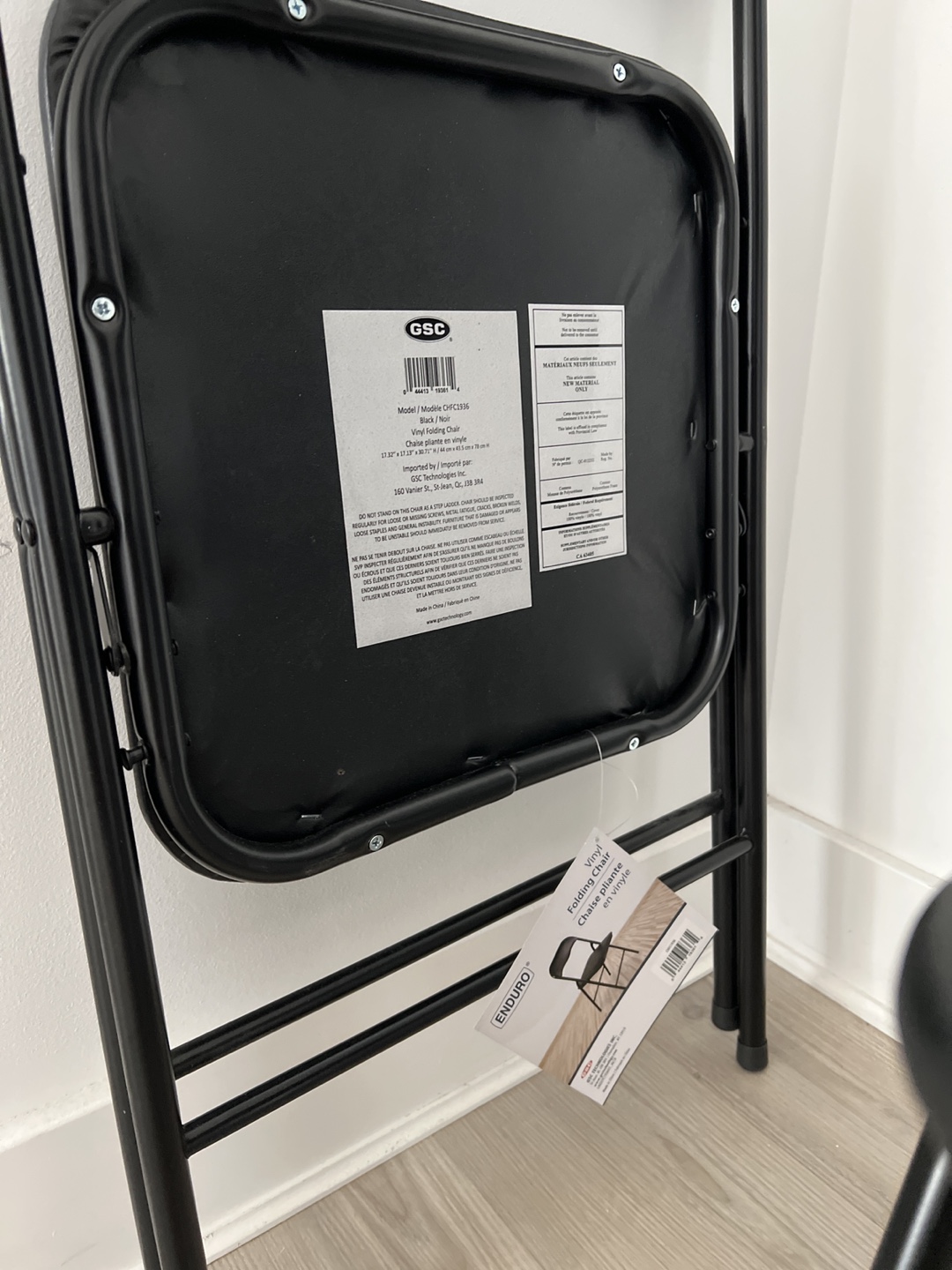 Selling black vinyl folding chairs from Enduro! This chair is perfect for extra seating when you have guests over or for any situation where you need a lightweight and portable chair. It's easy to store and set up!
