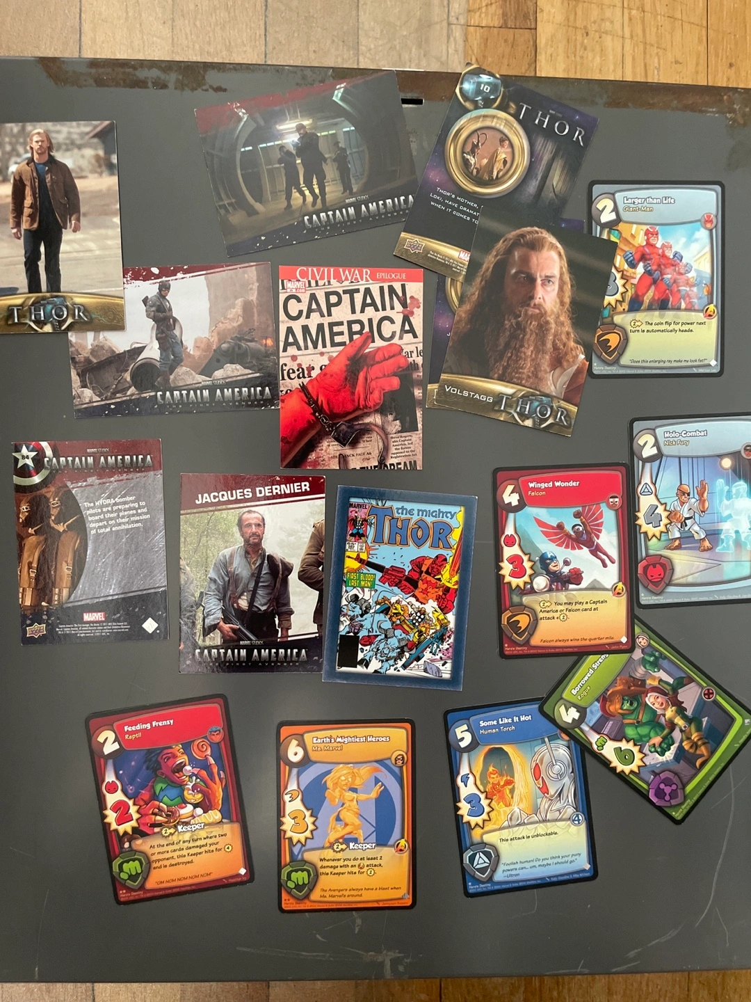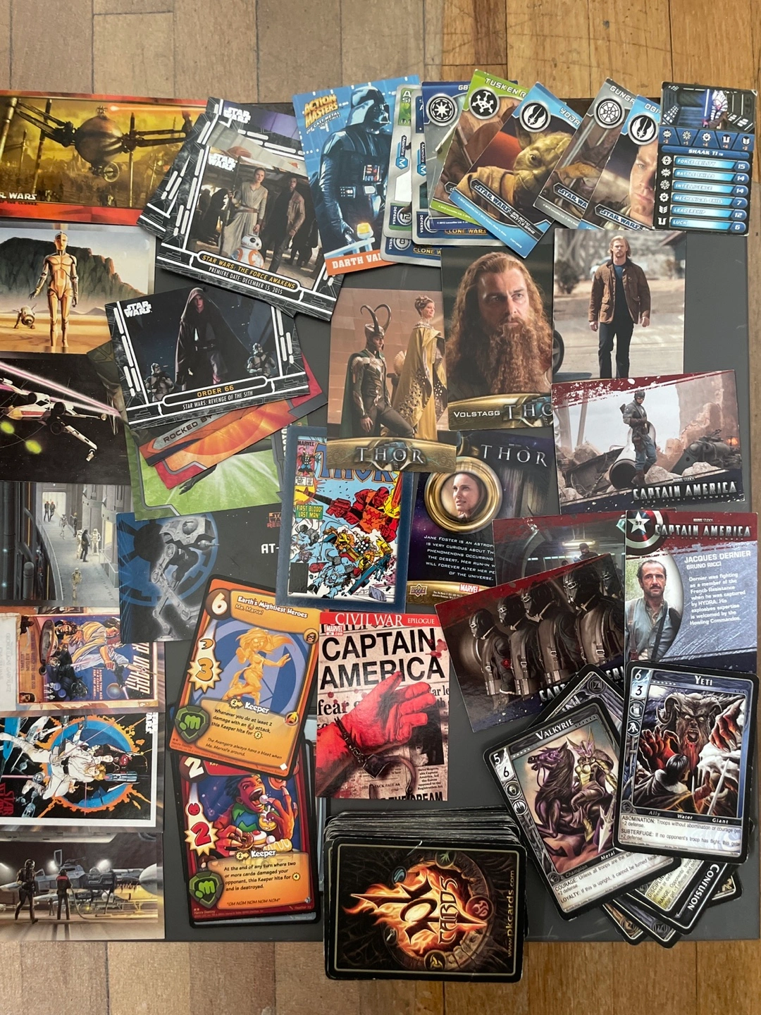 Selling a mixed lot of trading cards featuring characters and scenes from Star Wars, Marvel (including Captain America and Thor), Great for collectors or anyone looking to start a new hobby. PK cards as well with cool characters