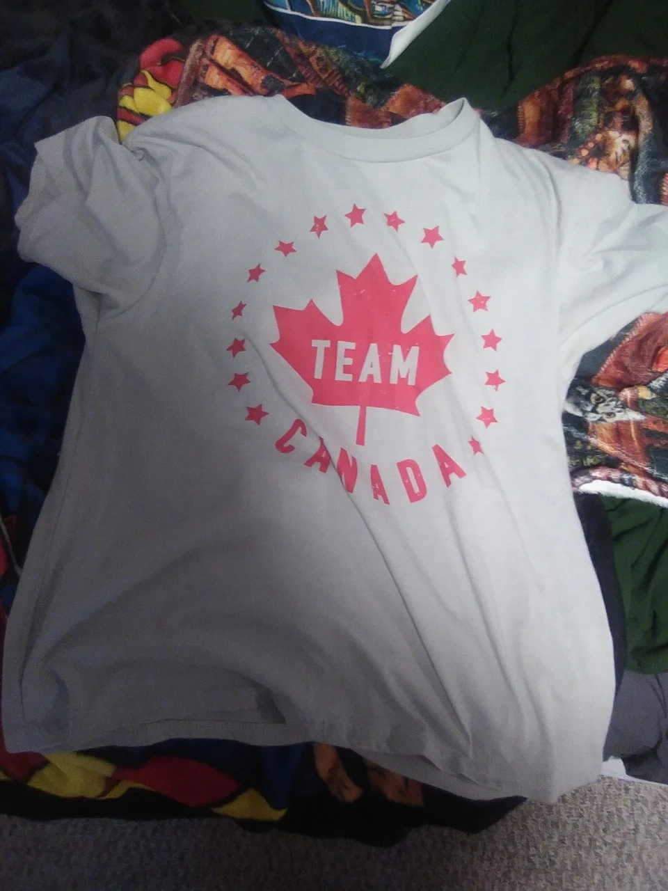 two graphic t shirts. the grey Canada one is a large kids size from michaels and only worn once;the turquoise one is a medium boys quite old but still in like new condition. $5 each or 5$ both