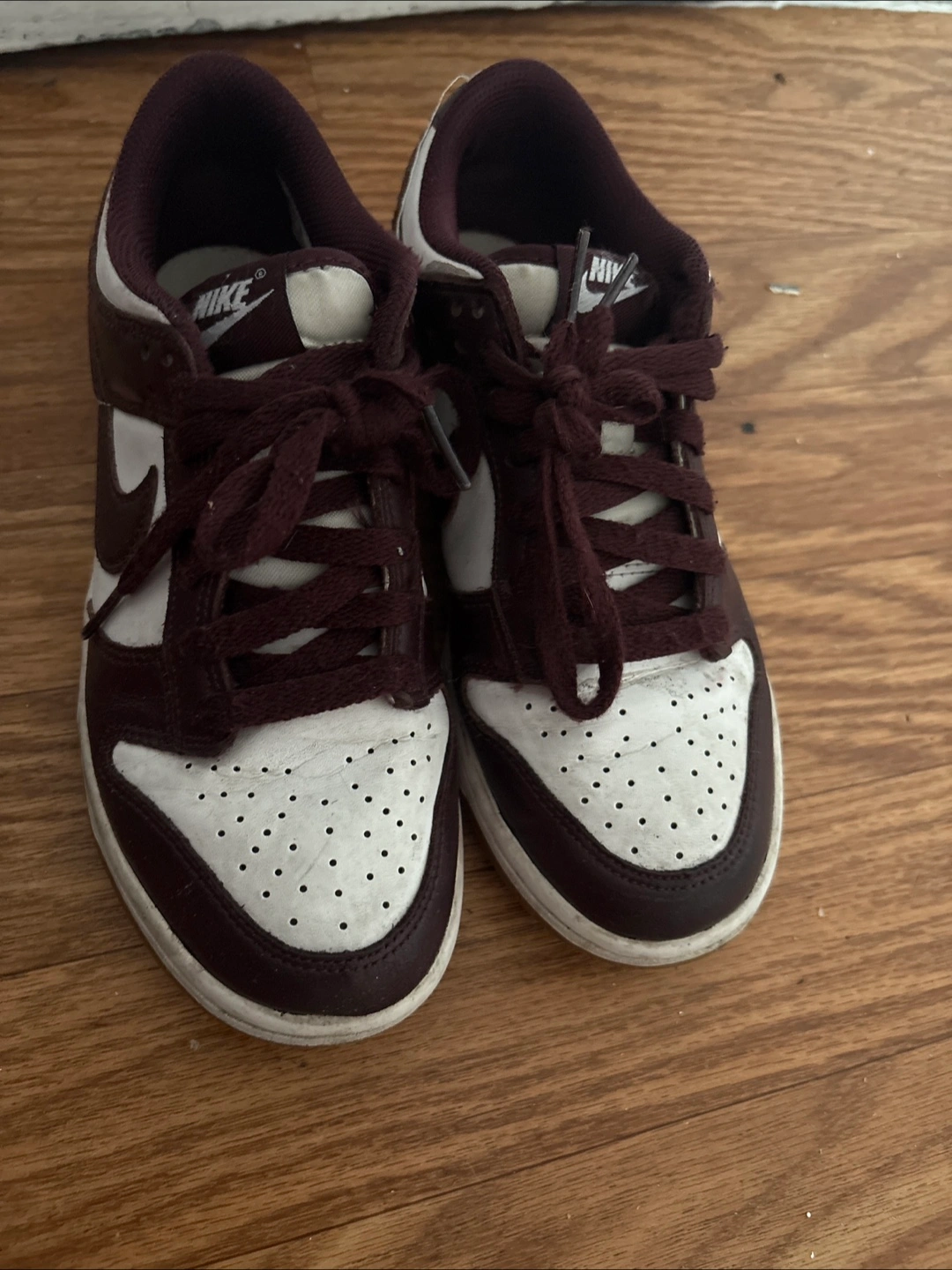 Selling a pair of Nike Dunk Low shoes in a maroon and white. These are in used condition, as shown in the pictures. They are a stylish and classic sneaker that would be a great addition to your wardrobe!