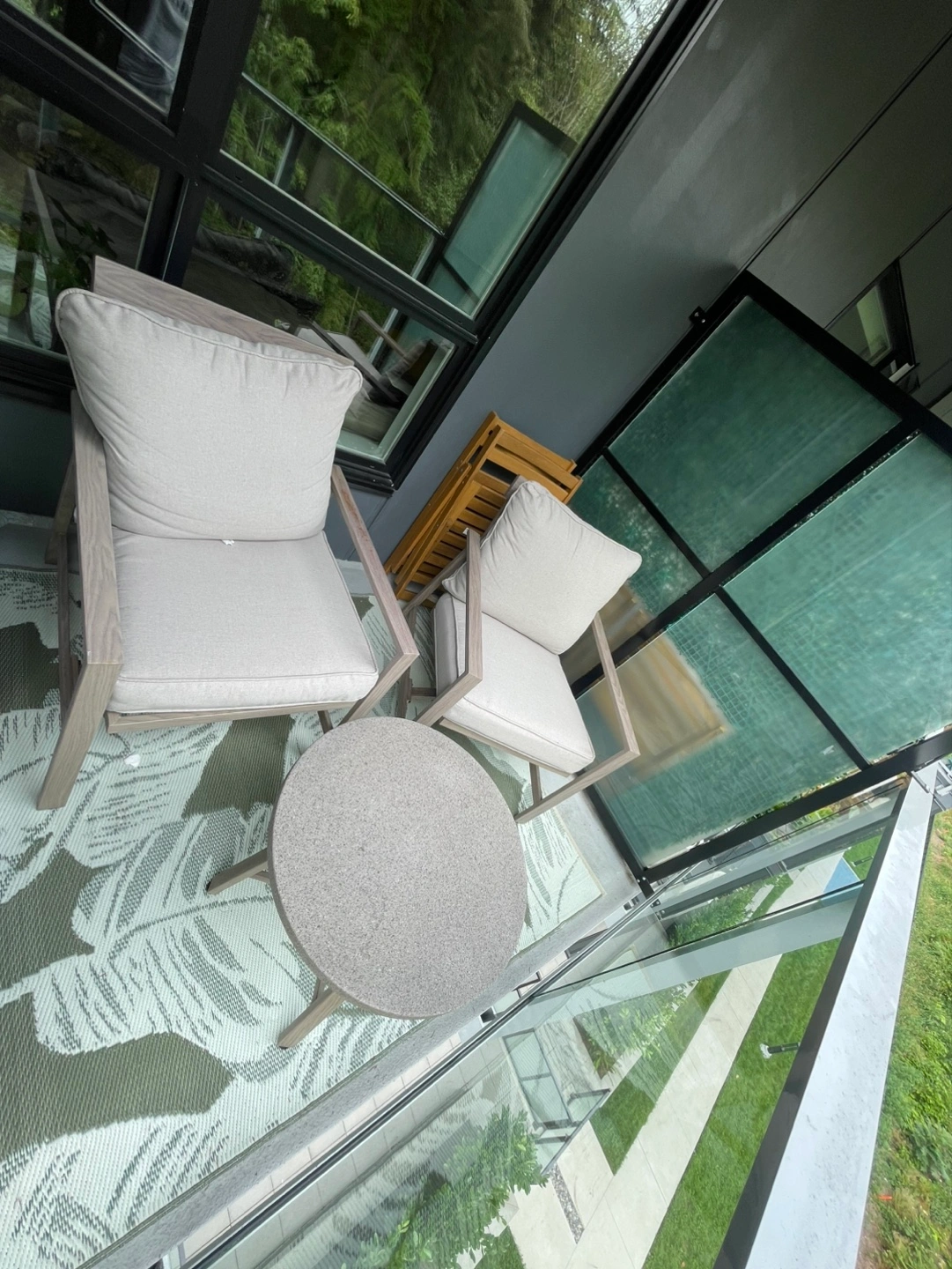 Selling a cute outdoor chair and table set! Perfect for a balcony or small patio. The set includes two chairs with comfy cushions and a small round table. There are some signs of use on the wooden frames.