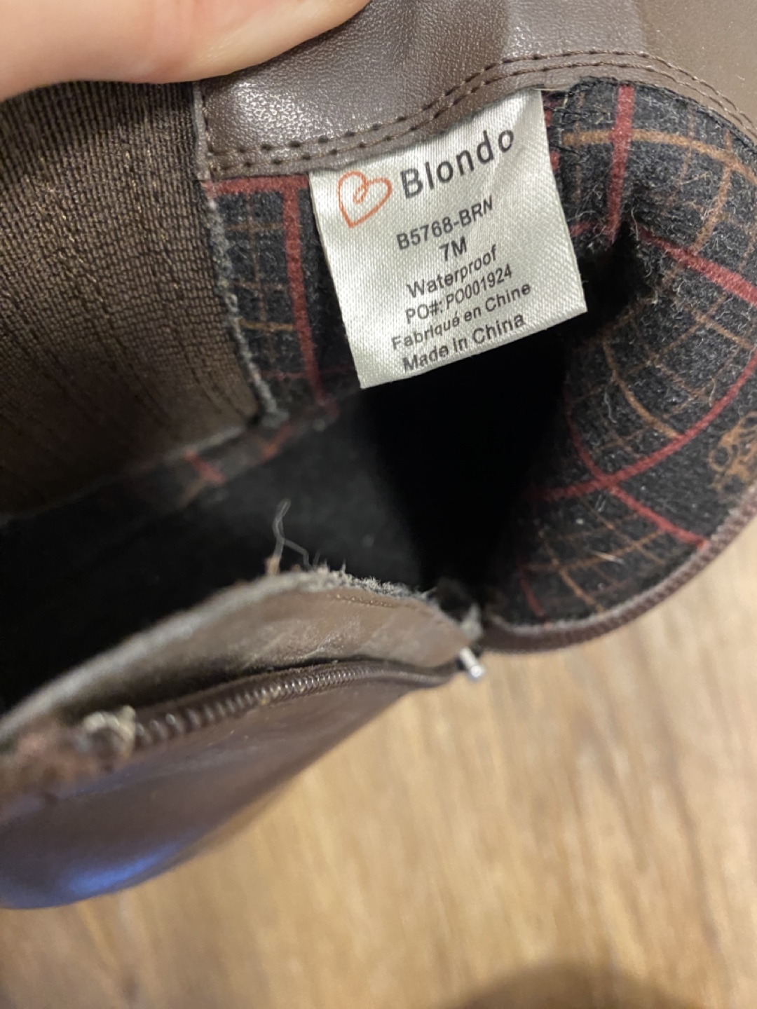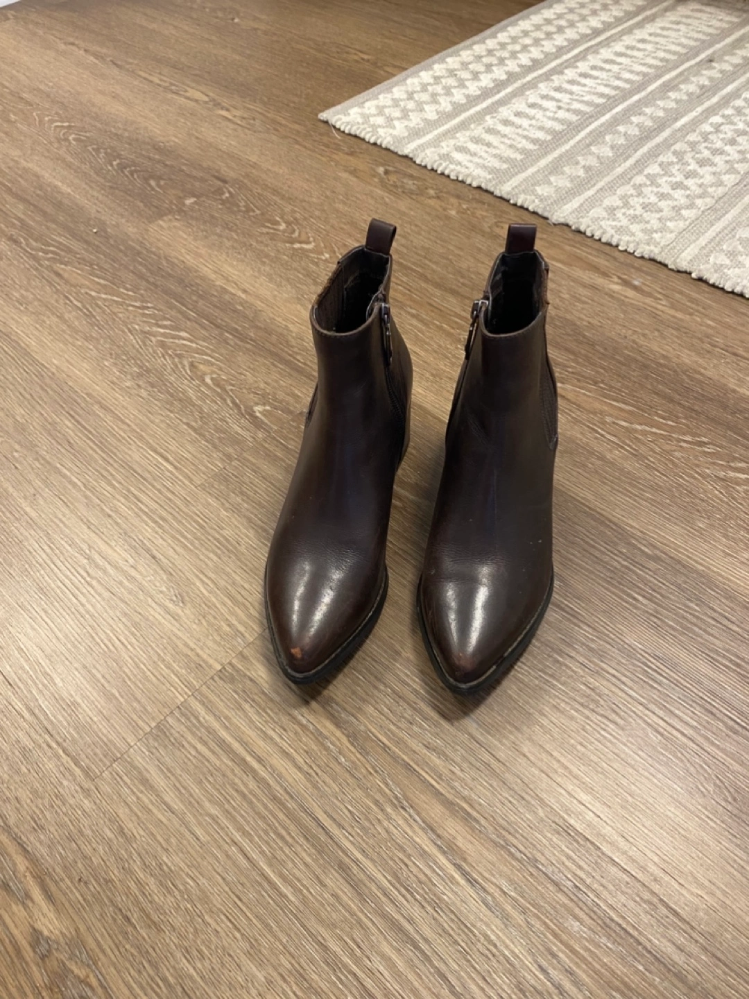 Selling a pair of ankle boots in a dark brown colour. They're a size 7. They have some minor scuff marks on the toes, but are still in good condition.