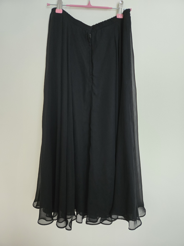 Black chiffon skirt. It's in great condition and would be a wonderful addition to any wardrobe! The material is lightweight and flowy, perfect for warmer weather or layering. Quality material. Lining under chiffon skirt