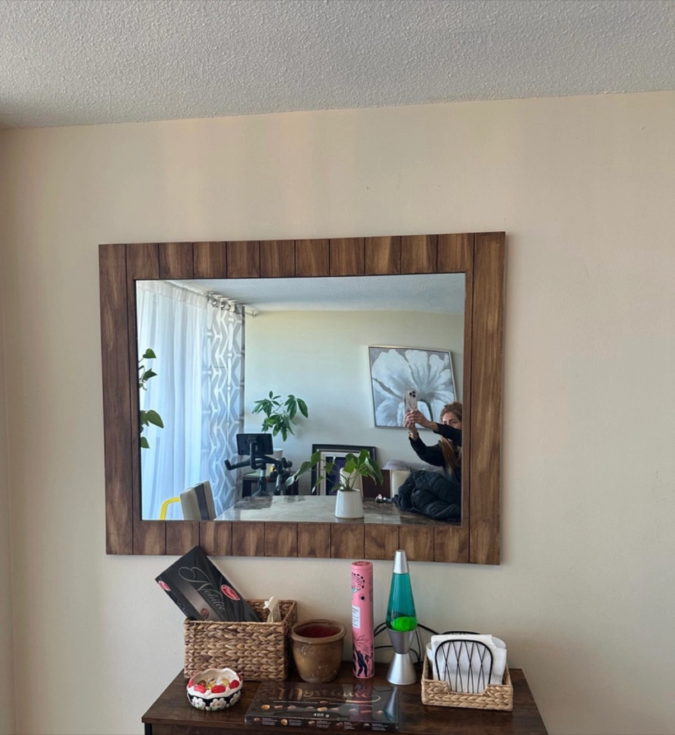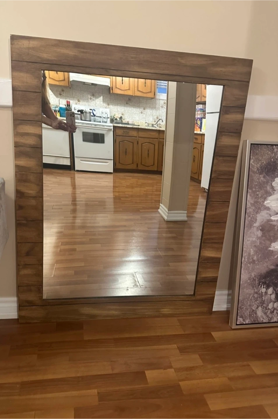 Selling a lovely wood framed wall mirror! It's in great shape and would look fantastic in any room. The wood frame has a nice, warm tone that complements the mirror perfectly. It's ready to bring some extra light and style to your place