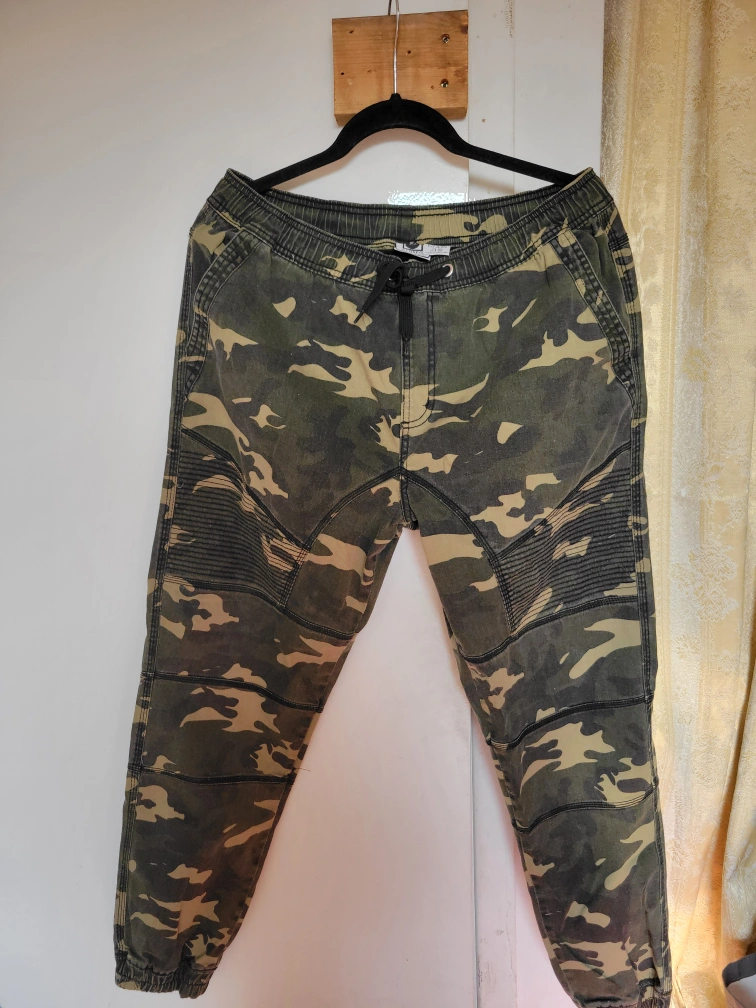 Here are some camouflage jogger pants! They feature a drawstring and elastic waistband, and elastic at the ankles. They're in great condition and ready for a new home