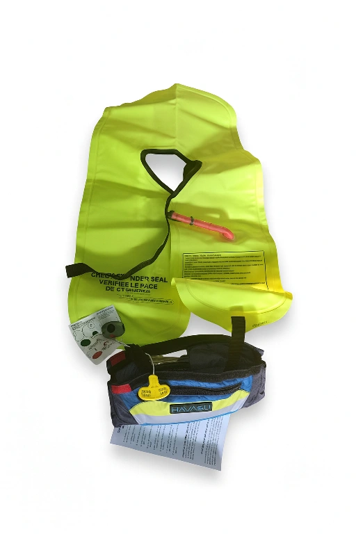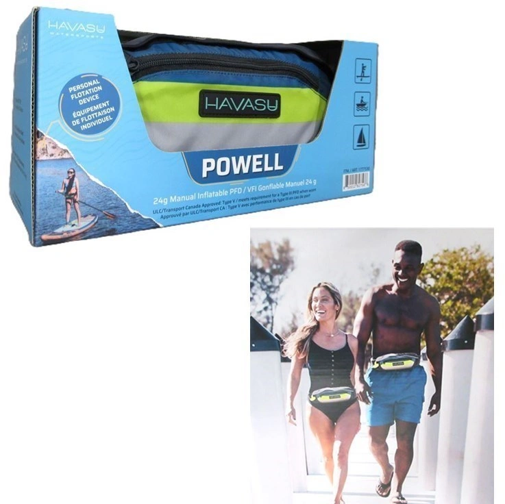 Selling a Havasu Watersports Powell inflatable belt pack PFD! This is a personal flotation device, perfect for paddleboarding or other water activities. It's a manual inflatable PFD/VFI gonflable manuel 24 g, approved by ULC/Transport Canada. Comes with the original box!
