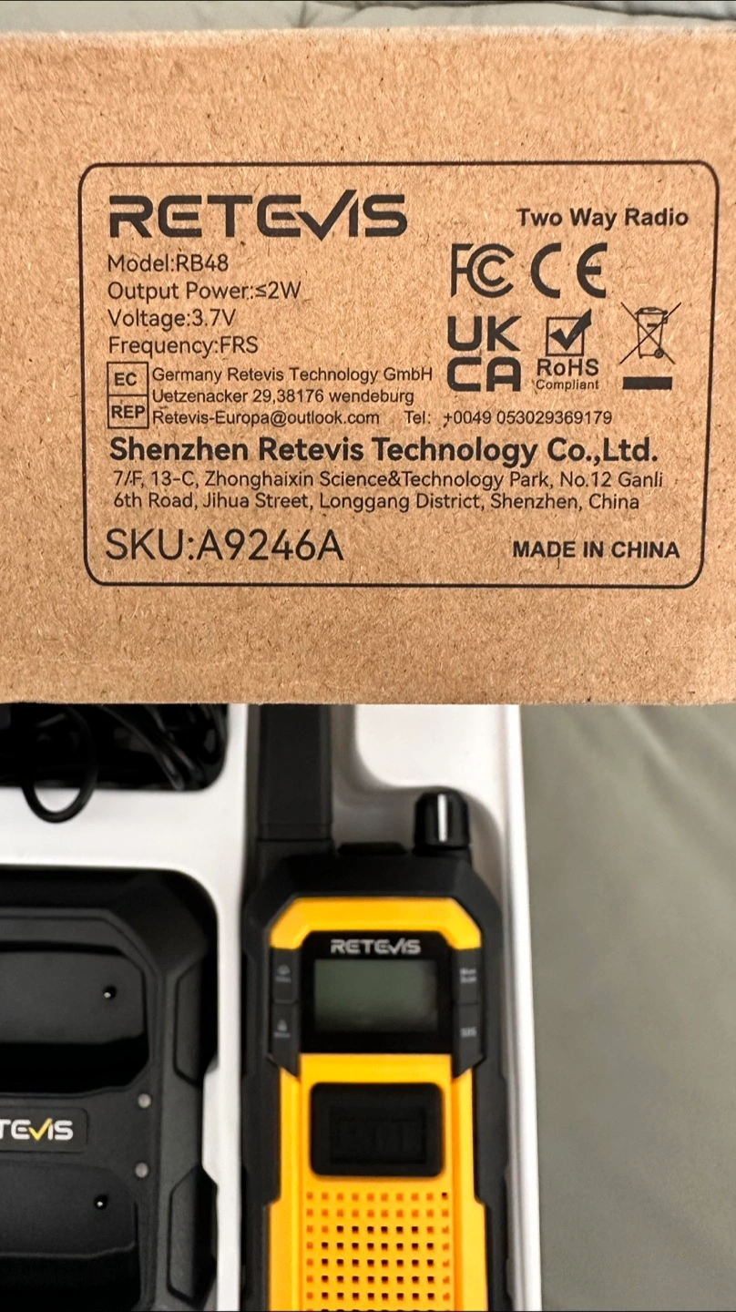 84Selling a set of Retevis RB48 two-way radios! This set includes the original box, charger, and all components. Key features: - Output Power: ≤2W - Voltage: 3.7V - Frequency: FRS New (open box)