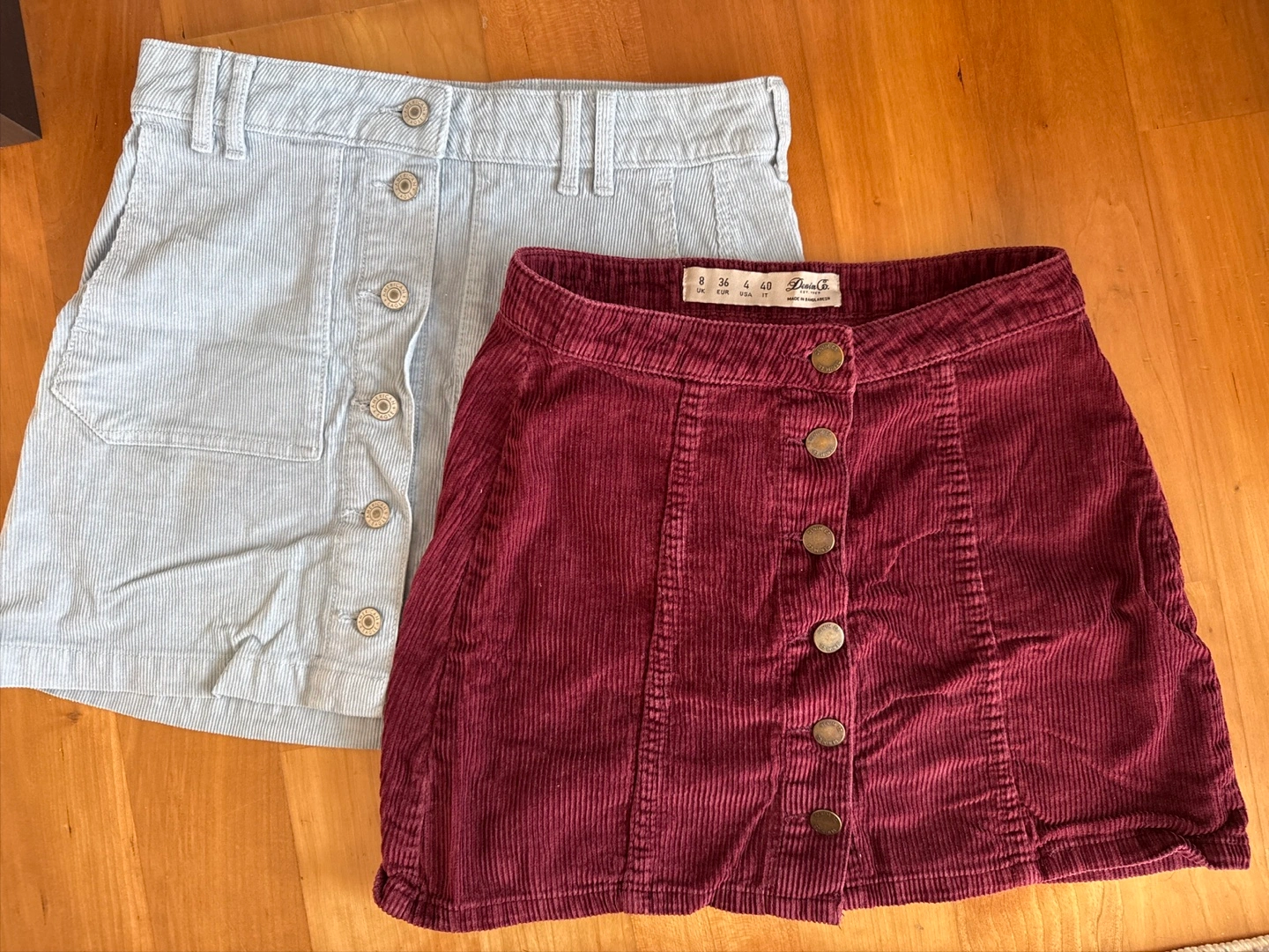 Two cute corduroy skirts. One is a light blue and the other is a burgundy colour.