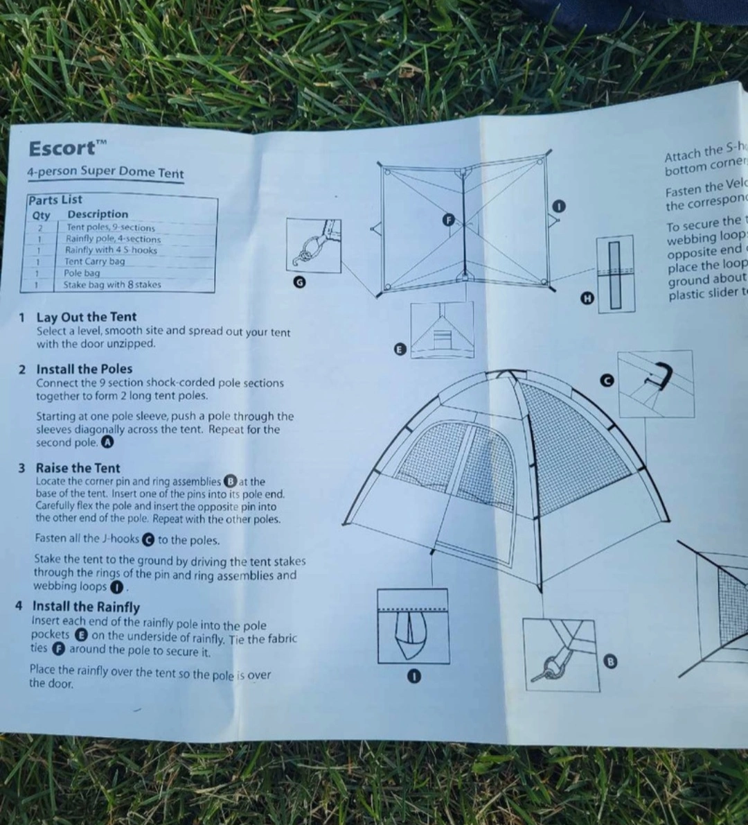 Selling an Escort 4-person Super Dome Tent! It comes with the parts list and instructions. This tent is perfect for camping trips and outdoor adventures. Easy to set up and pack away! never been used