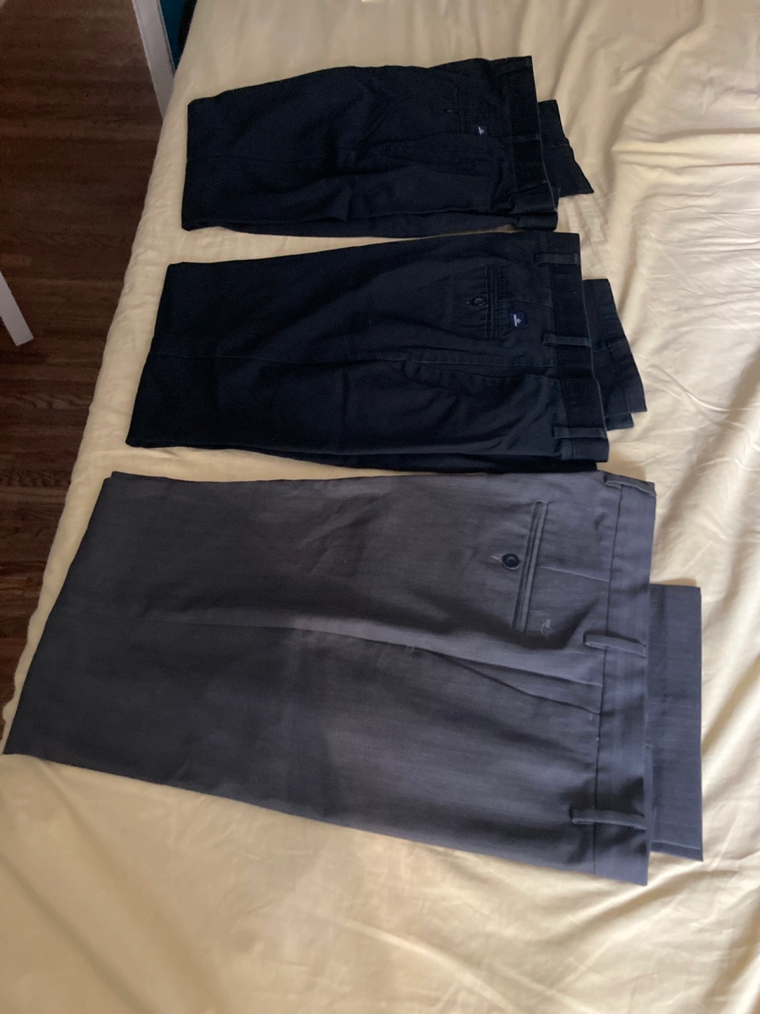 Selling a bundle of three pairs of Dockers men's dress pants. Two pairs are navy blue and one pair is grey. They're in great condition and ready for a new home! Size 34. Inseam:1 blue is 31 1/2 2nd blue is 31 Grey is 34 Take all 3 for only $6!