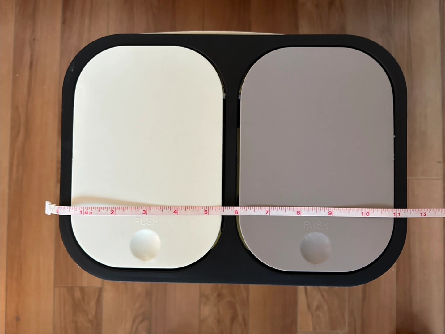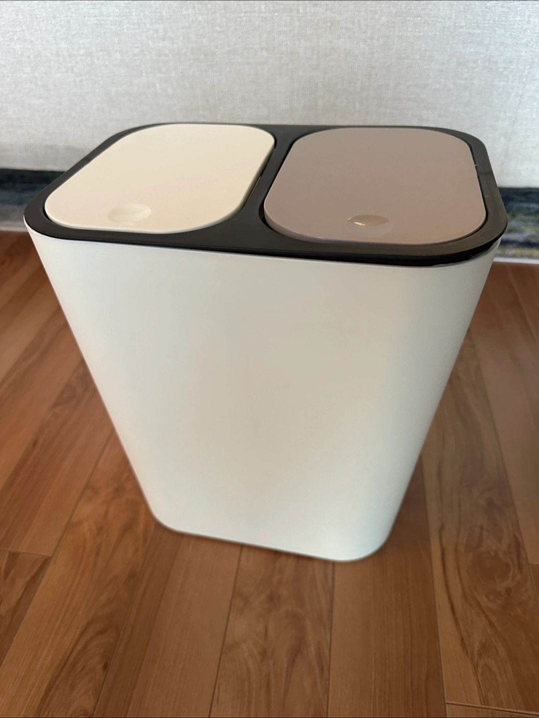 Selling a brand new dual compartment recycling/garbage bin! It features a white and grey colour scheme. The bin is approximately 11.5 inches wide and 13 inches tall.