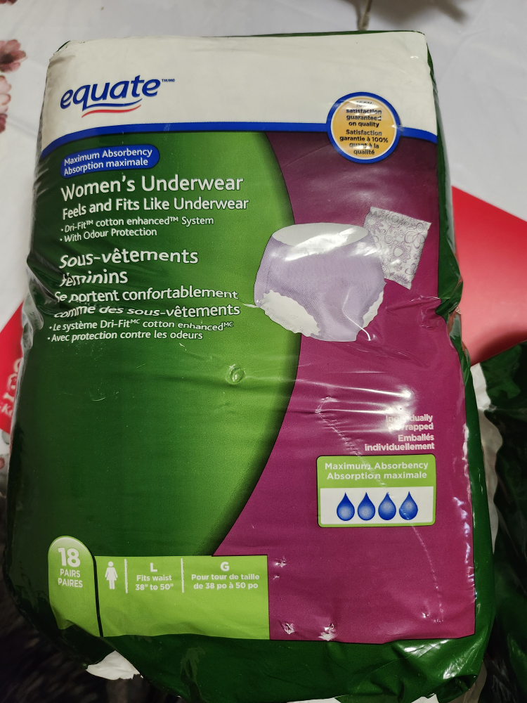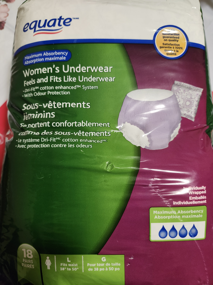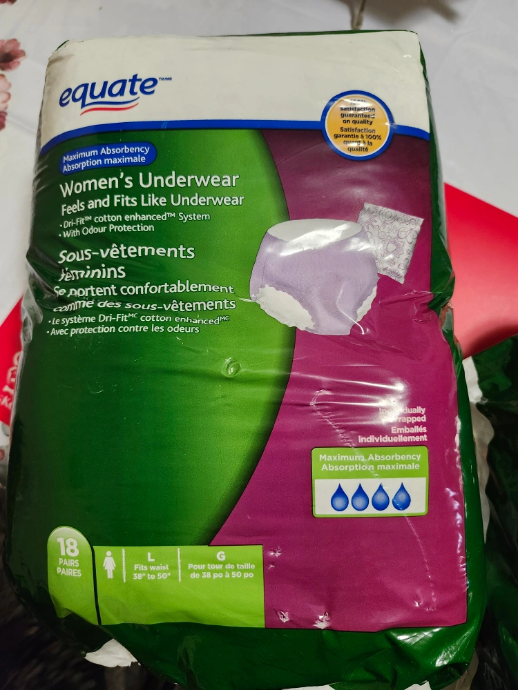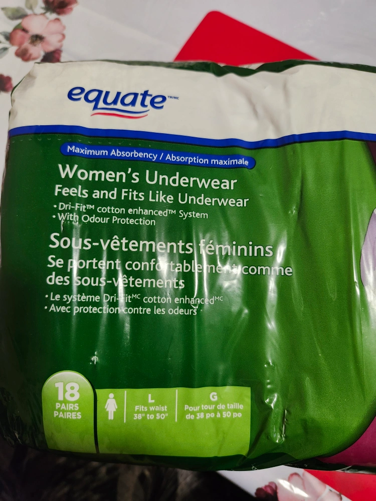 Equate Women's Underwear, Maximum Absorbency, feels and fits like underwear. Size Large, fits waist 38" to 50". 18 pairs per package. Features Dri-Fit cotton enhanced system with odour protection