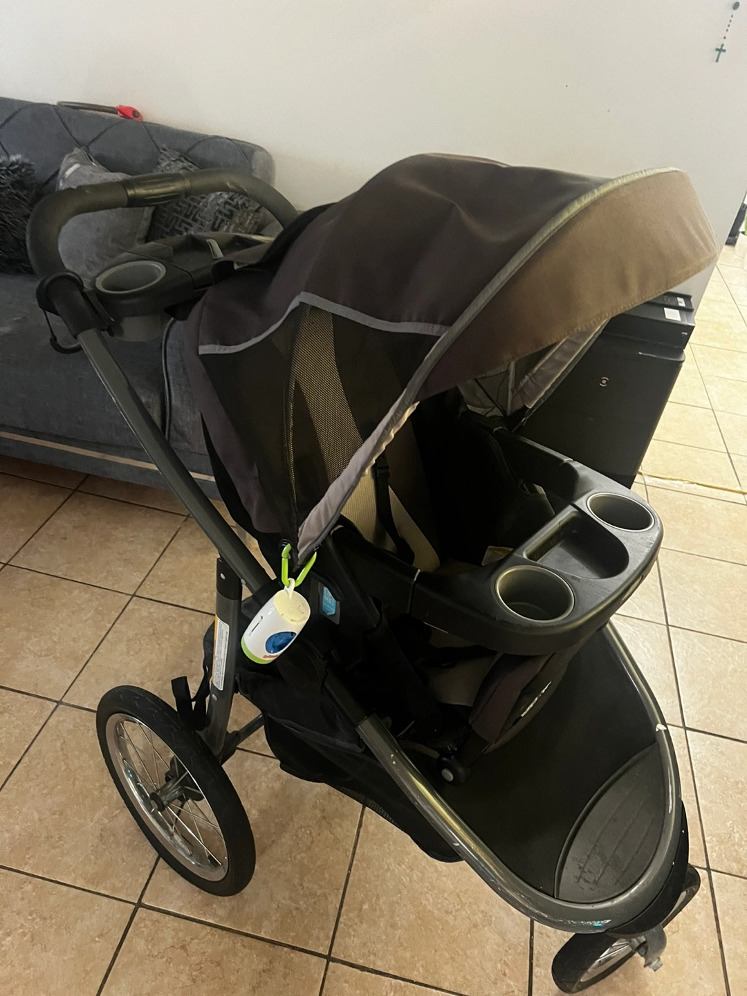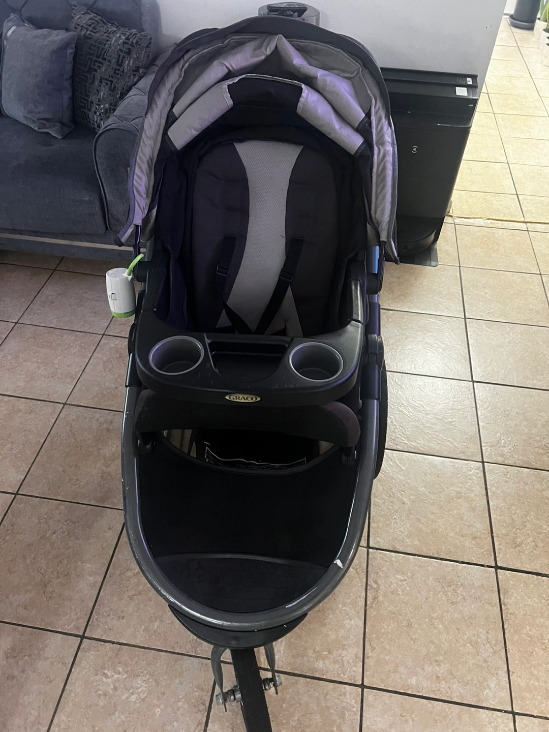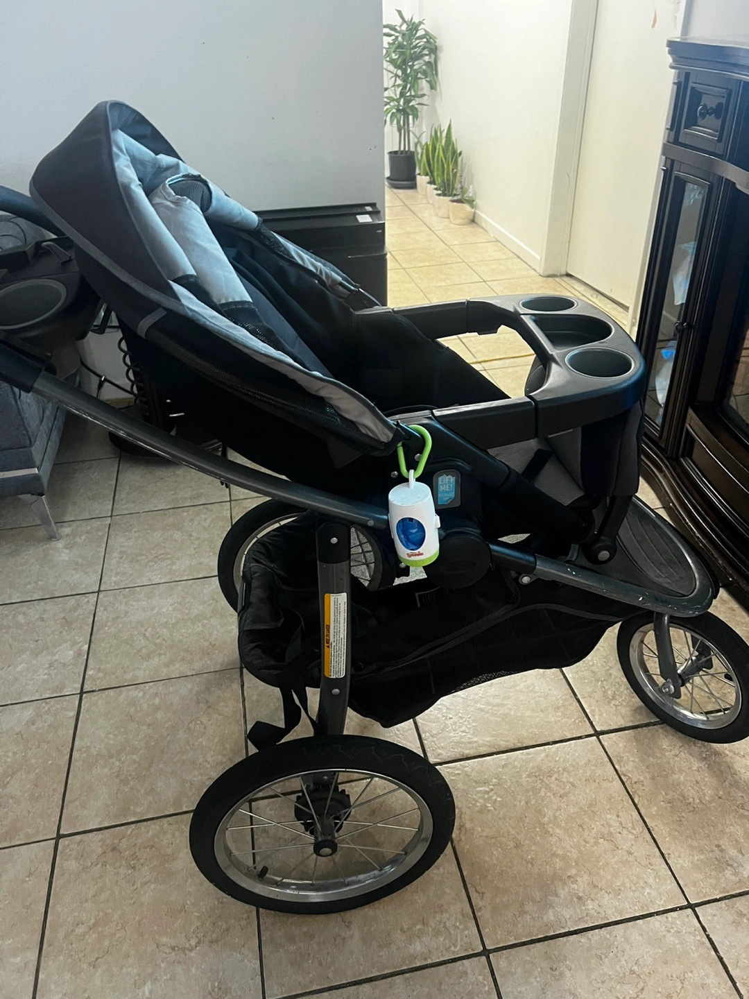 Selling a used Graco jogger stroller. It features a parent tray with cup holders and a large storage basket underneath. Perfect for walks and runs! Very neat and clean with no stains, will take any price you have in mind.