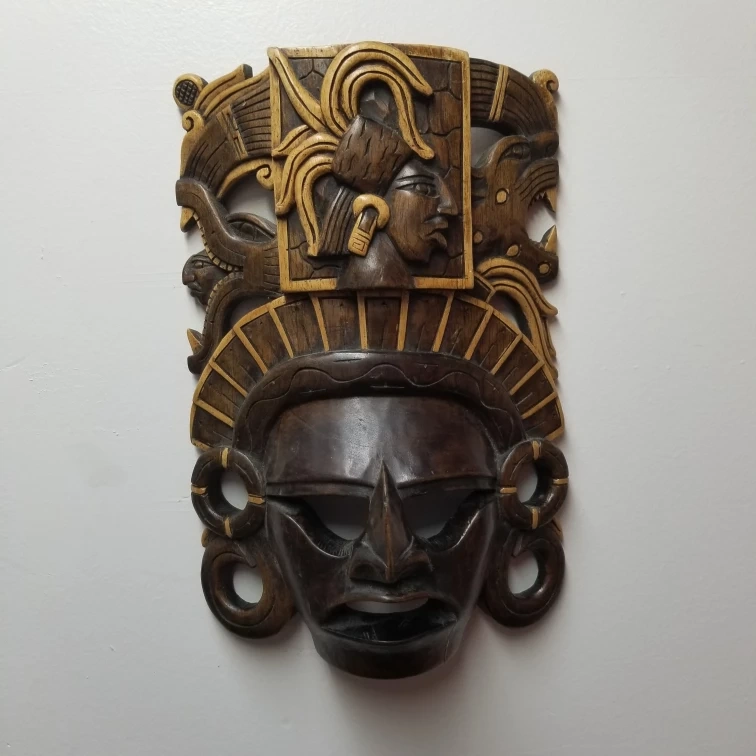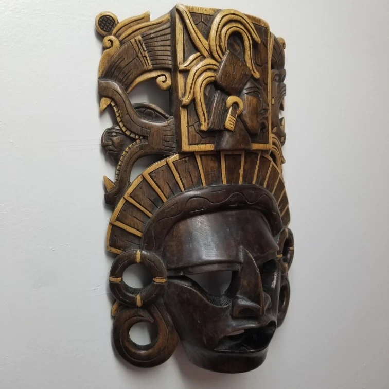 Selling a unique wooden Mayan mask. It's a cool piece of wall decor with intricate carvings and a dark brown finish. It would look great in any room