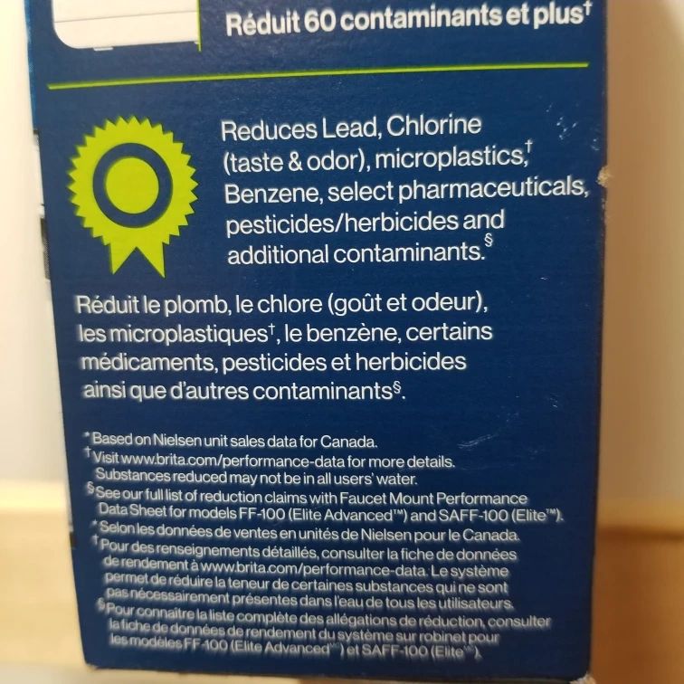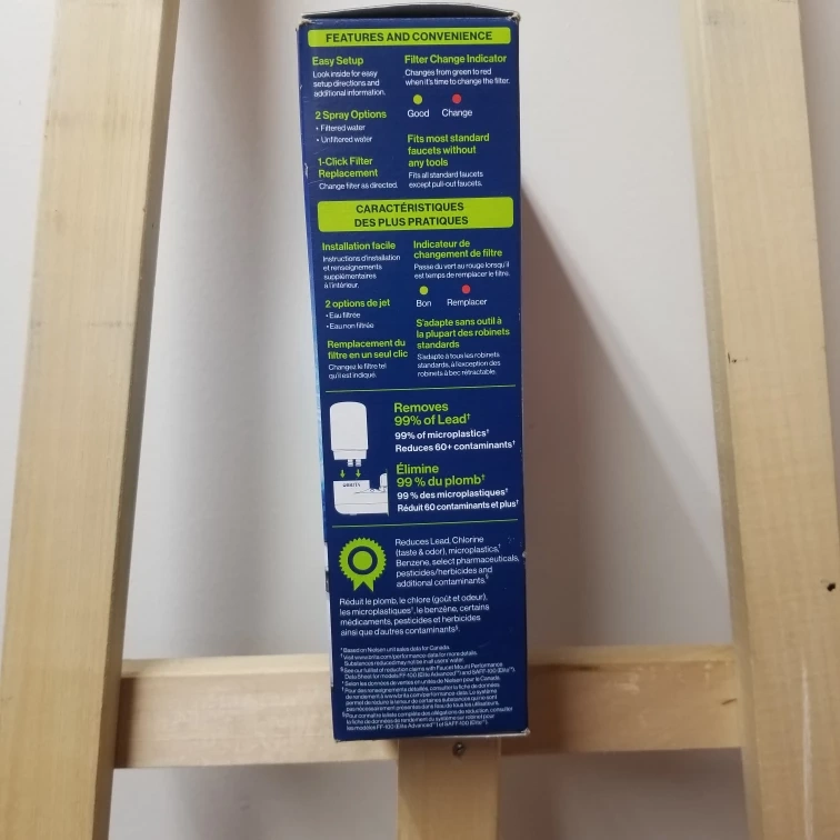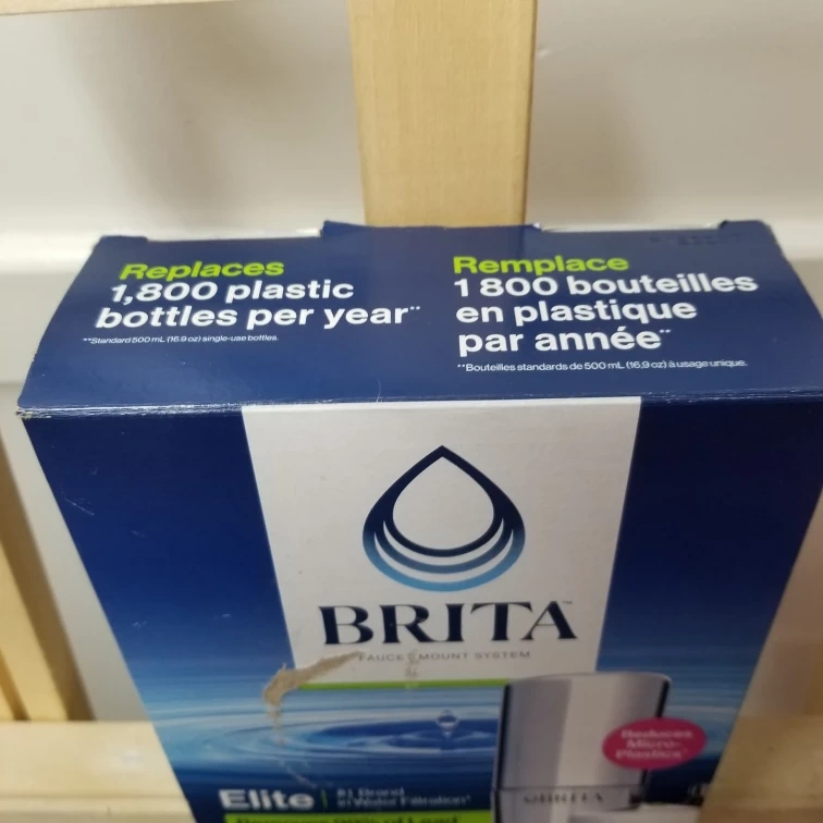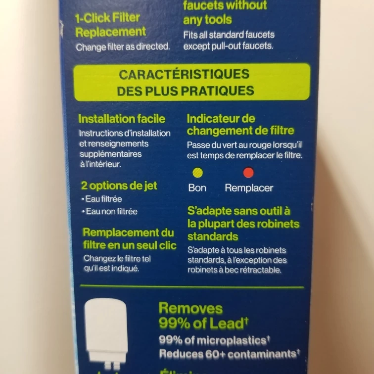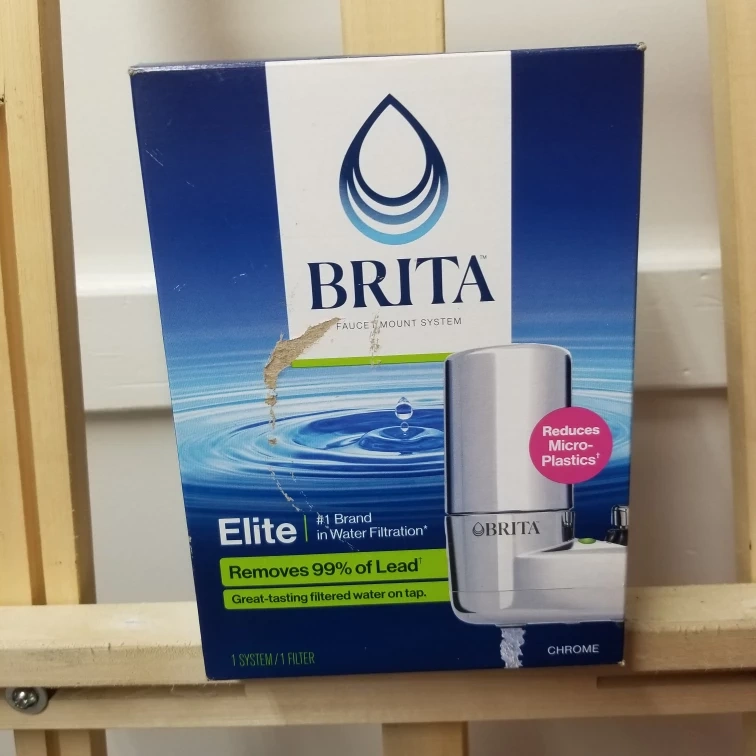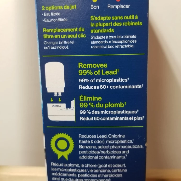 Brita Faucet Mount System in Chrome. It replaces 1,800 plastic bottles per year. It removes 99% of Lead and 99% of microplastics. It also reduces 60+ contaminants. It has a filter change indicator that changes from green to red when it's time to change the filter. Fits most standard faucets without any tools.
