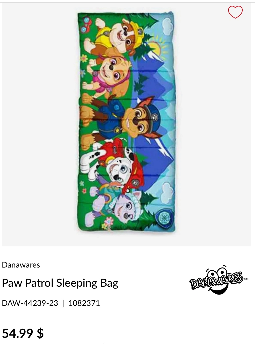 Snuggle up with this Paw Patrol sleeping bag from Canadian Tire ! It's perfect for little ones who love the show. This sleeping bag features a fun Paw Patrol design and comes with its own carrying bag for easy storage and transport. Originally bought for $54.99 but has a bit of stitch near the zipper