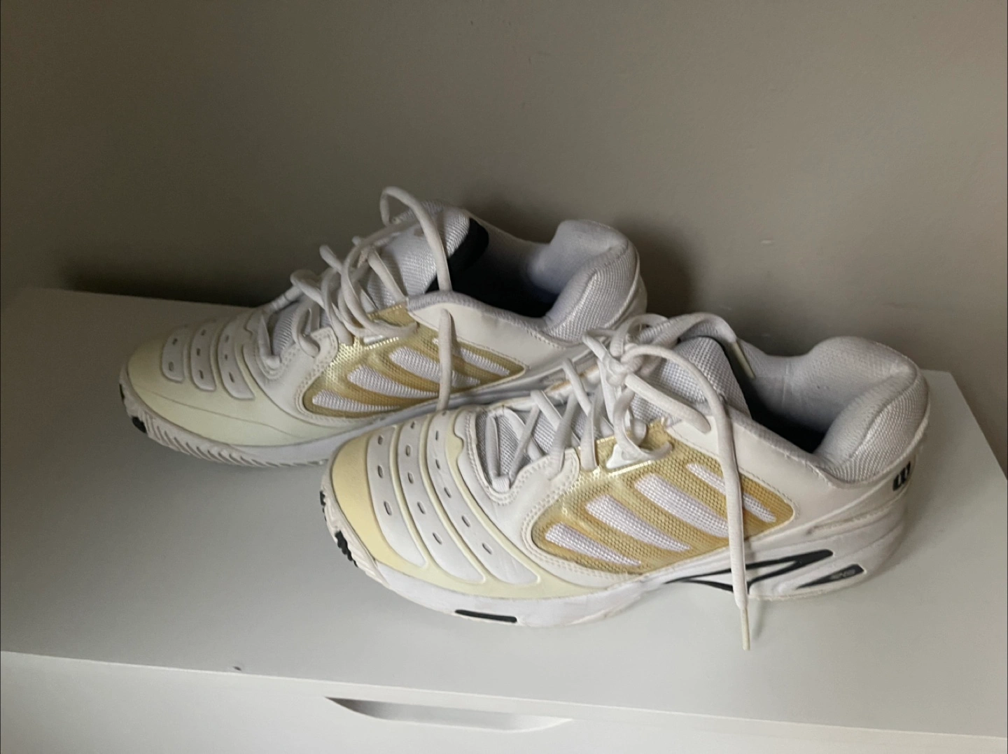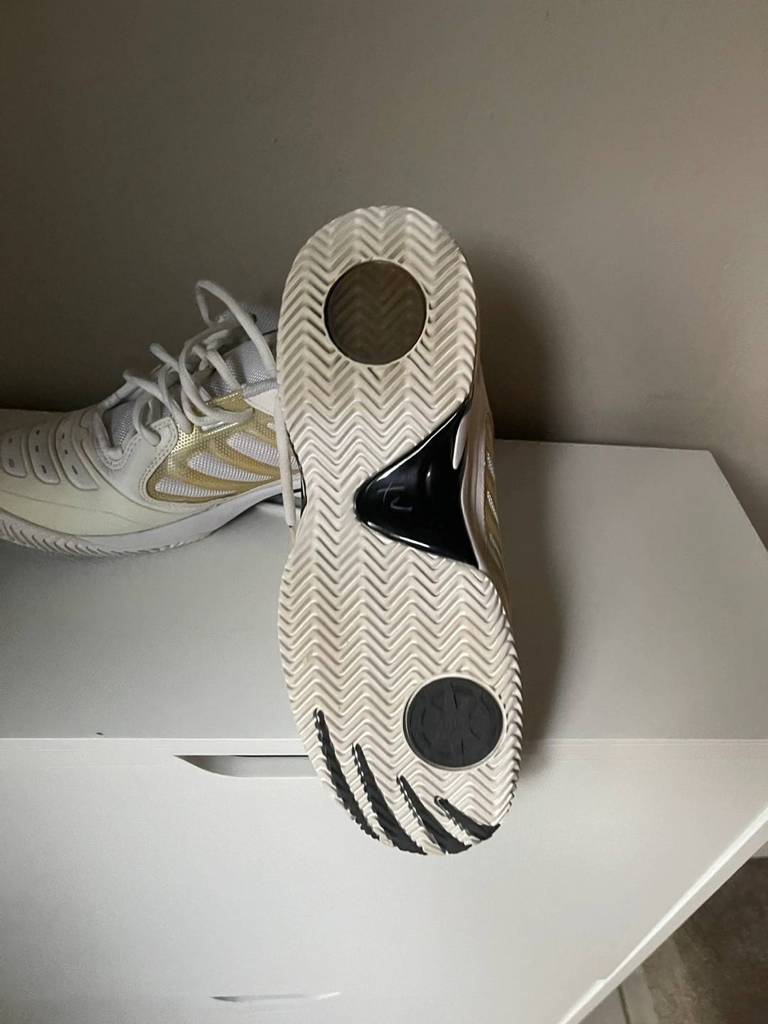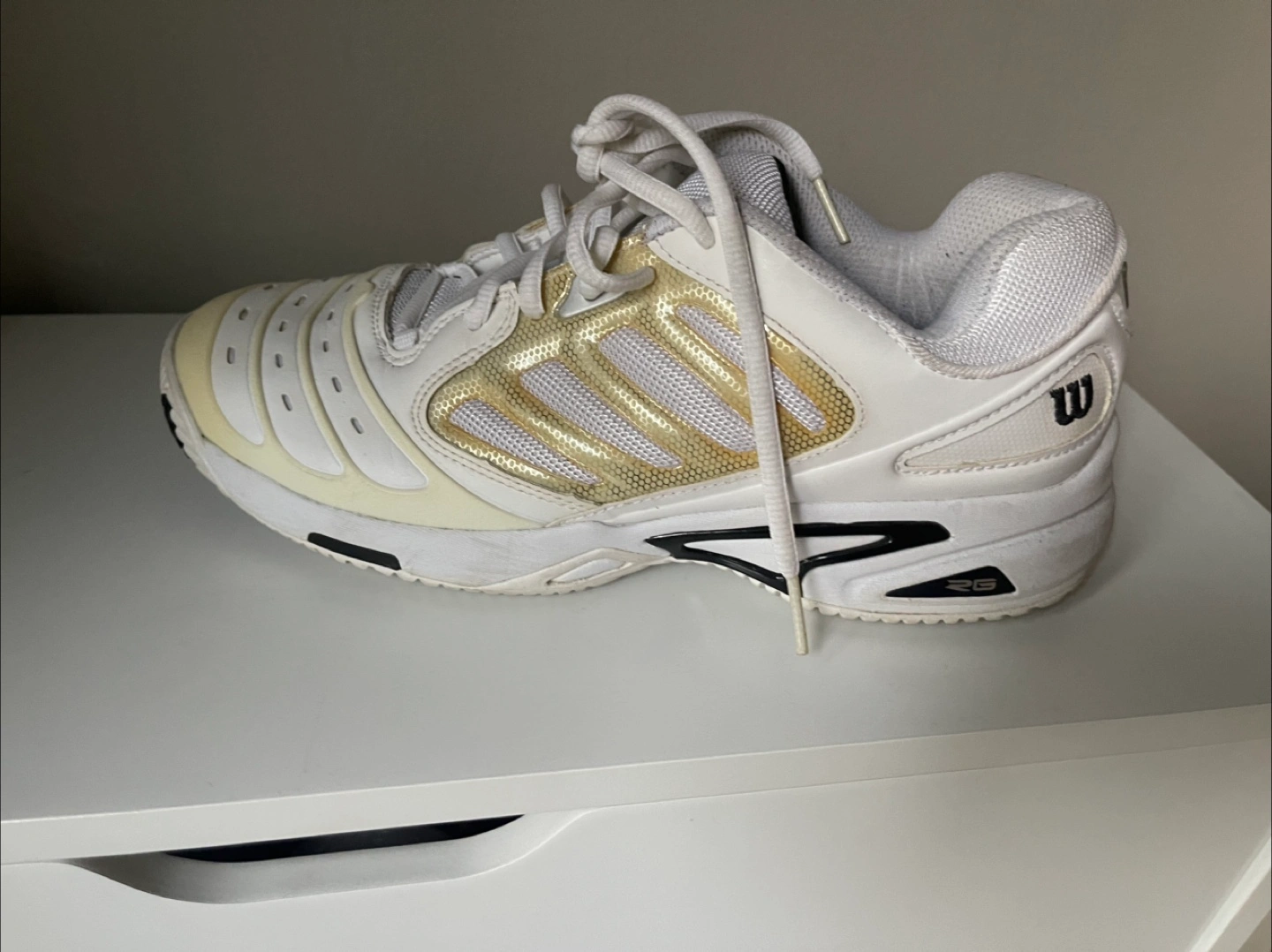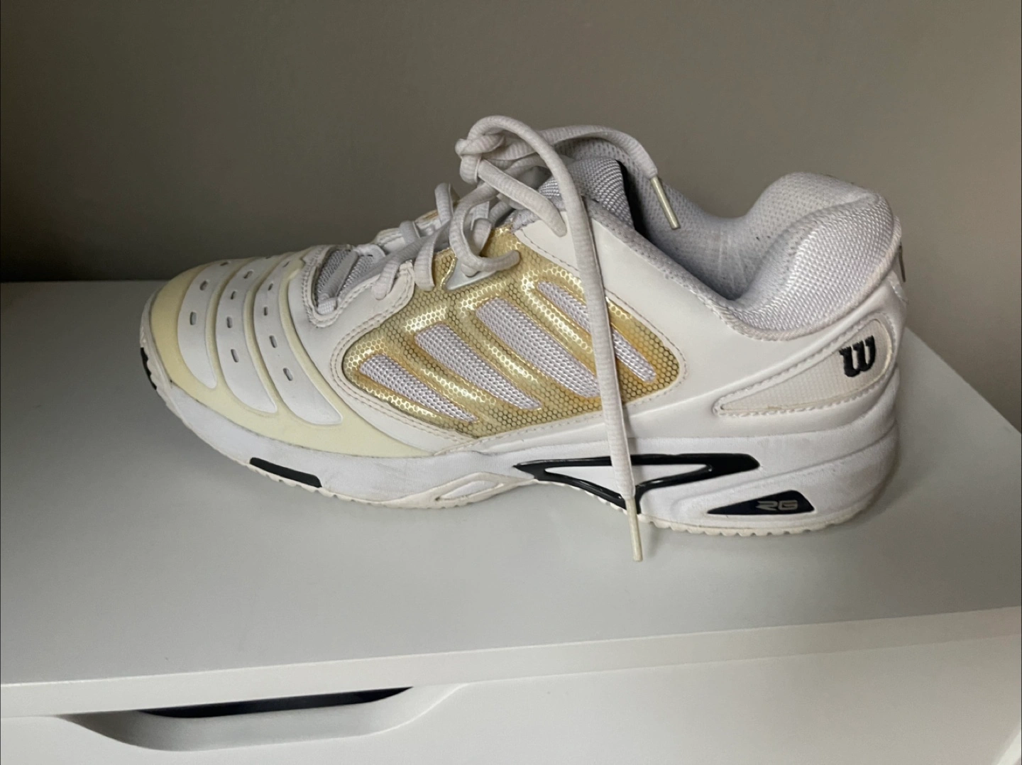 25Selling a pair of Wilson RG tennis shoes in size 8.5. They are white with gold accents. nice and clean new look Please see photos for details