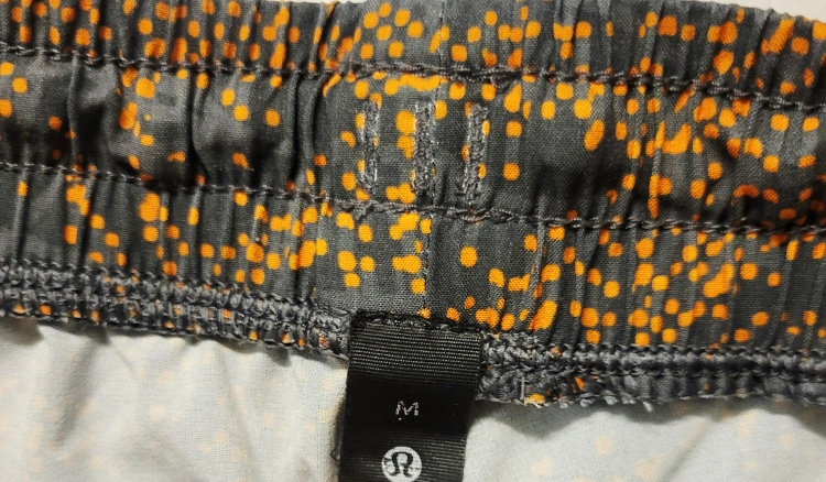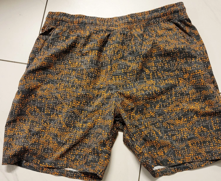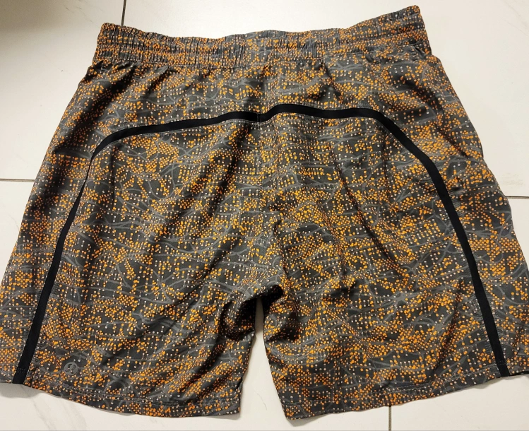 Selling a pair of Lululemon men's shorts in size medium. The shorts feature a unique pattern with orange dots on a grey background. Great for workouts or casual wear!