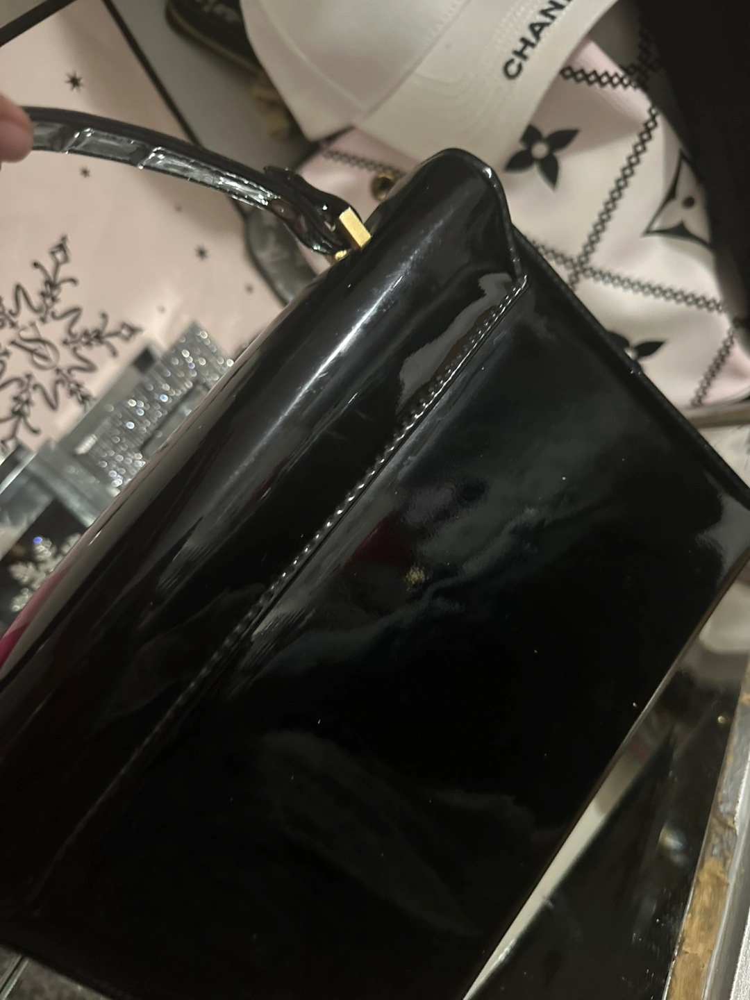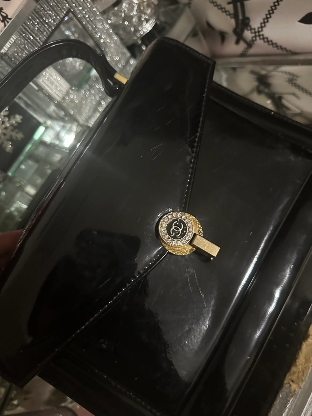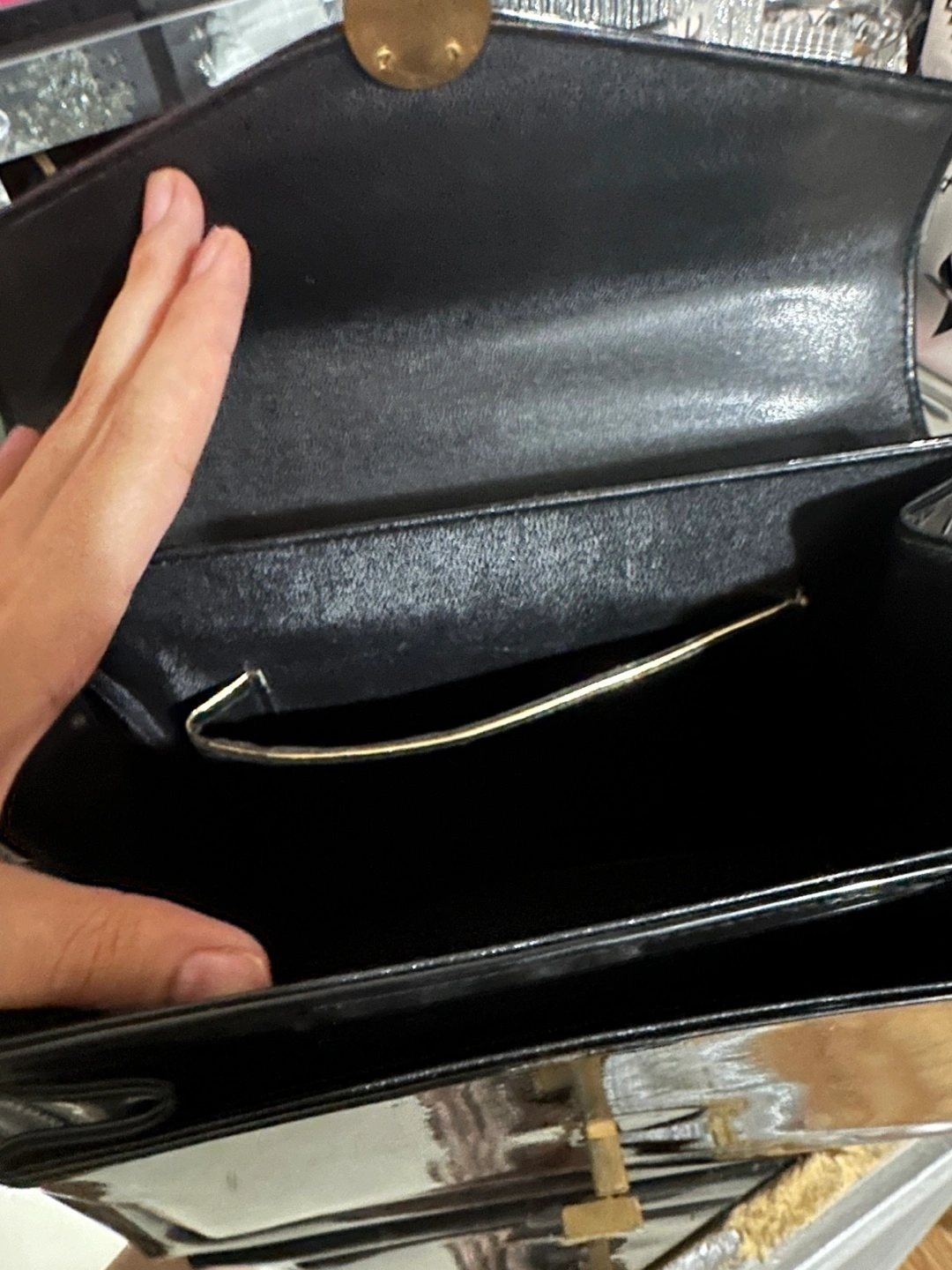 65I'm selling a vintage black patent leather handbag! It features a unique gold-tone clasp with a circular design. The bag has a structured shape and a classic look.