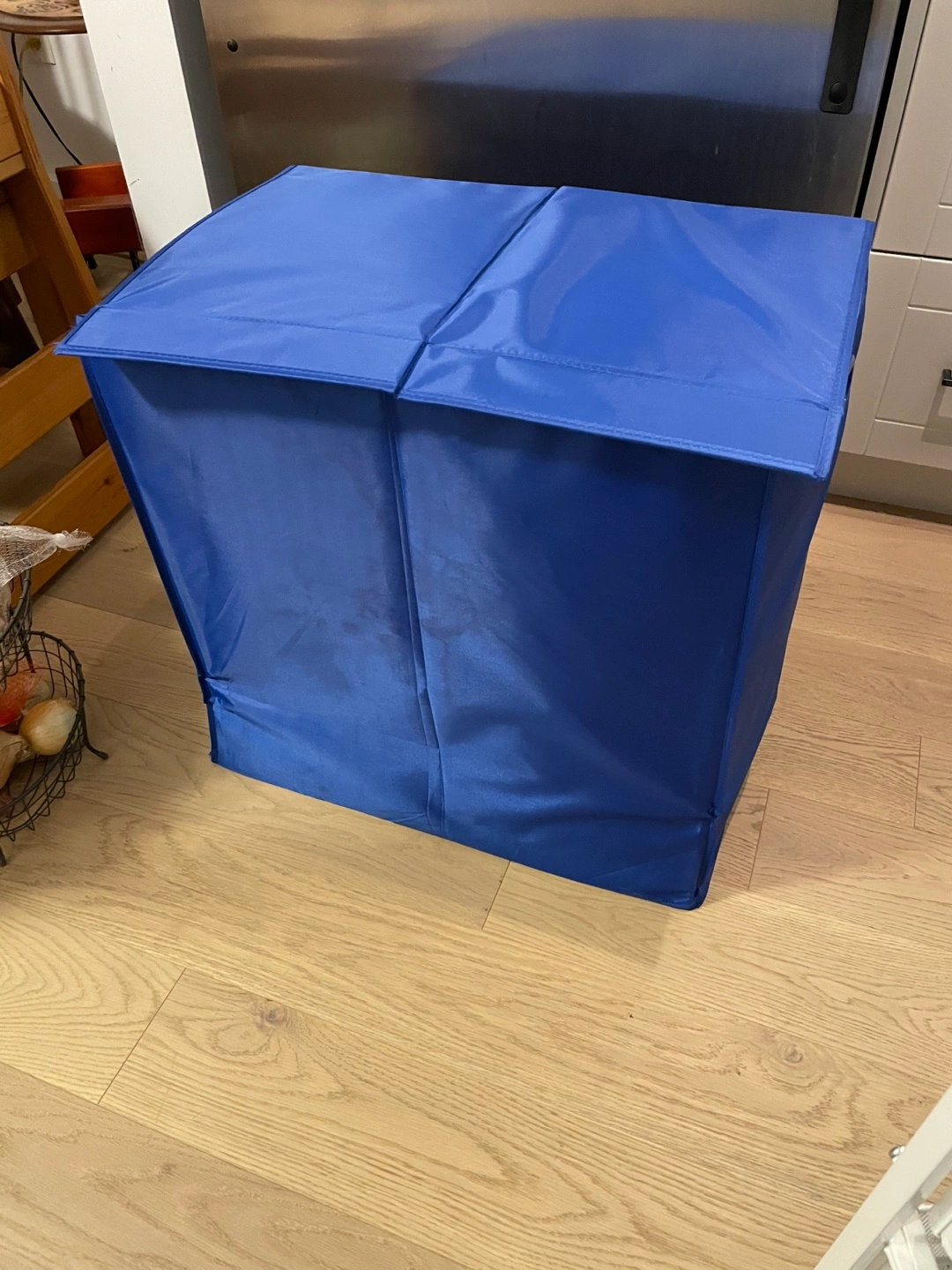 Selling a blue laundry hamper. It has a lid and two compartments inside 13 x23 inches, height is 22 inches Cash only