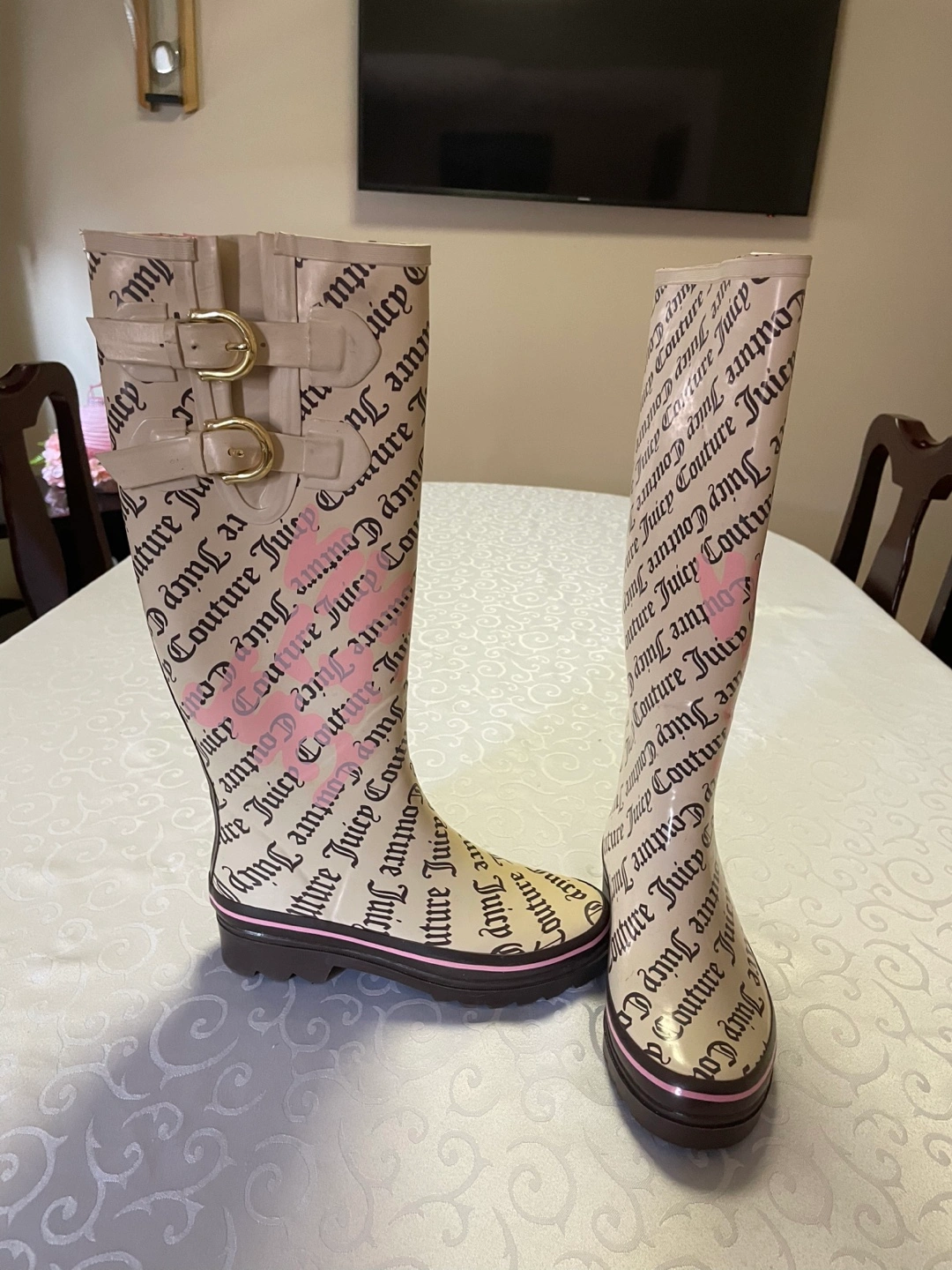 These Juicy Couture rain boots are perfect for keeping your feet dry and stylish on those wet days! They feature the iconic Juicy Couture logo and design. Never been worn