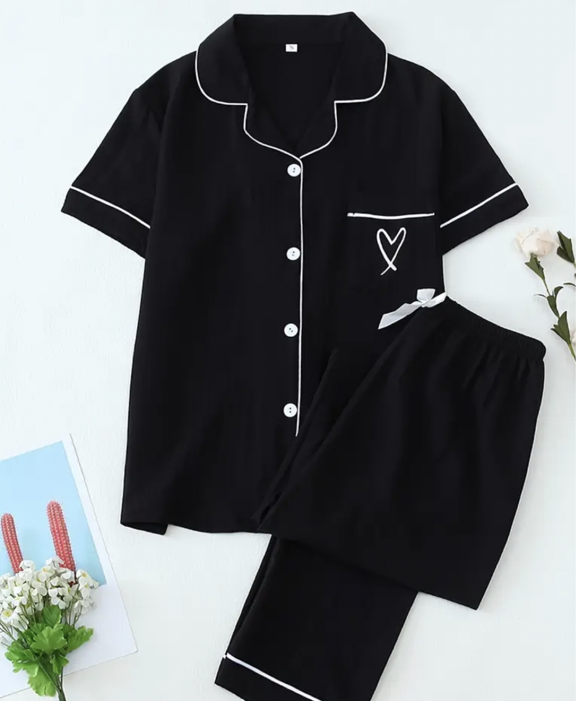 Cute black pajama set with white trim! The top has a heart detail on the pocket. Perfect for a cozy night in