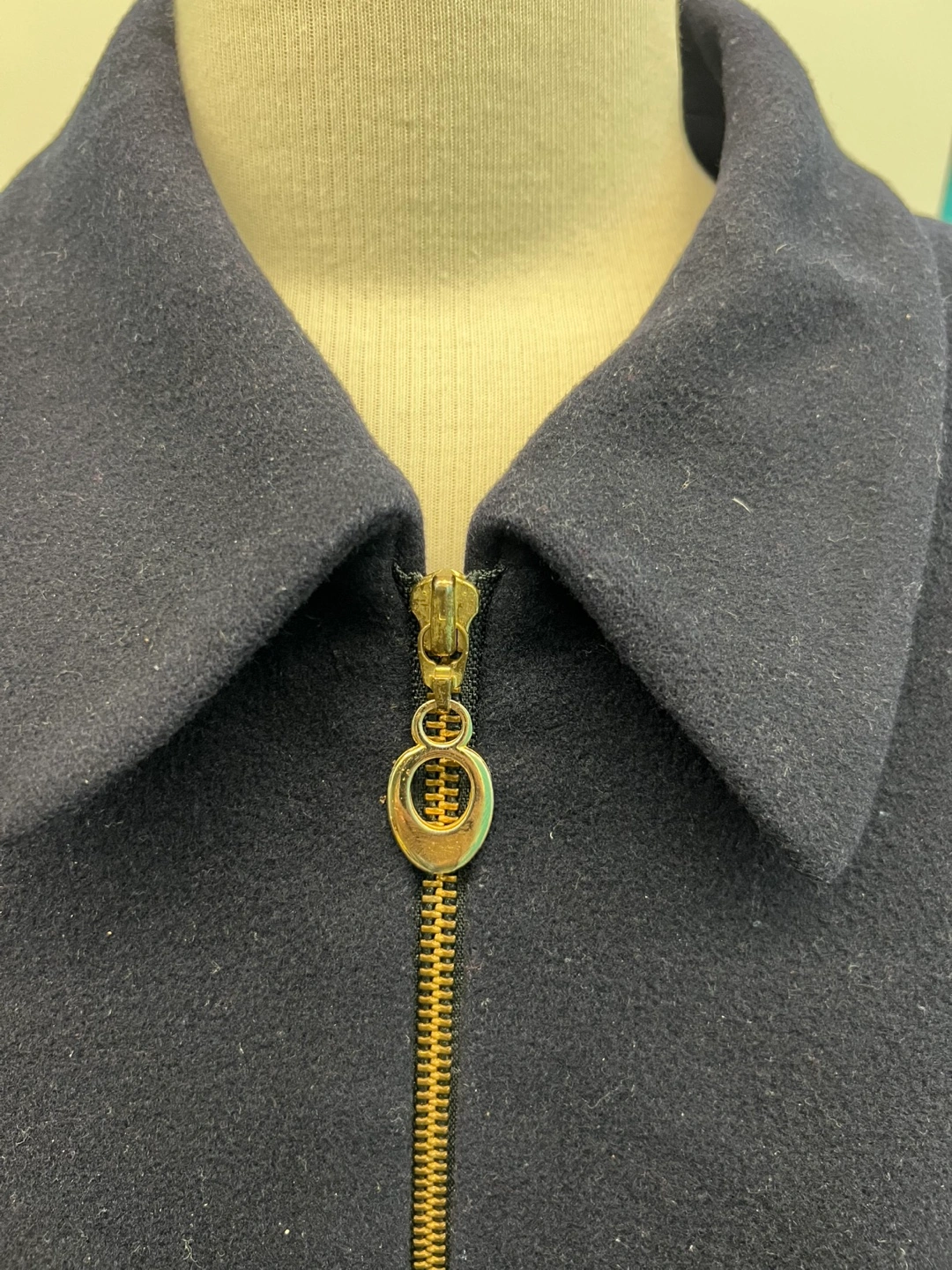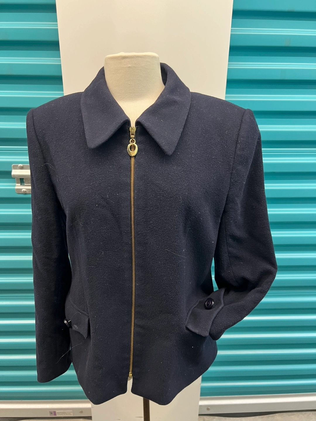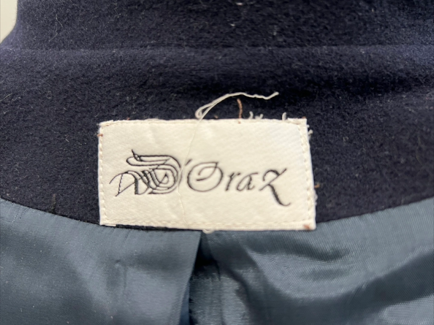 Here's a stylish navy blue wool jacket from D'OraK! It features a unique zipper pull and a classic design. Perfect for adding a touch of elegance to your wardrobe