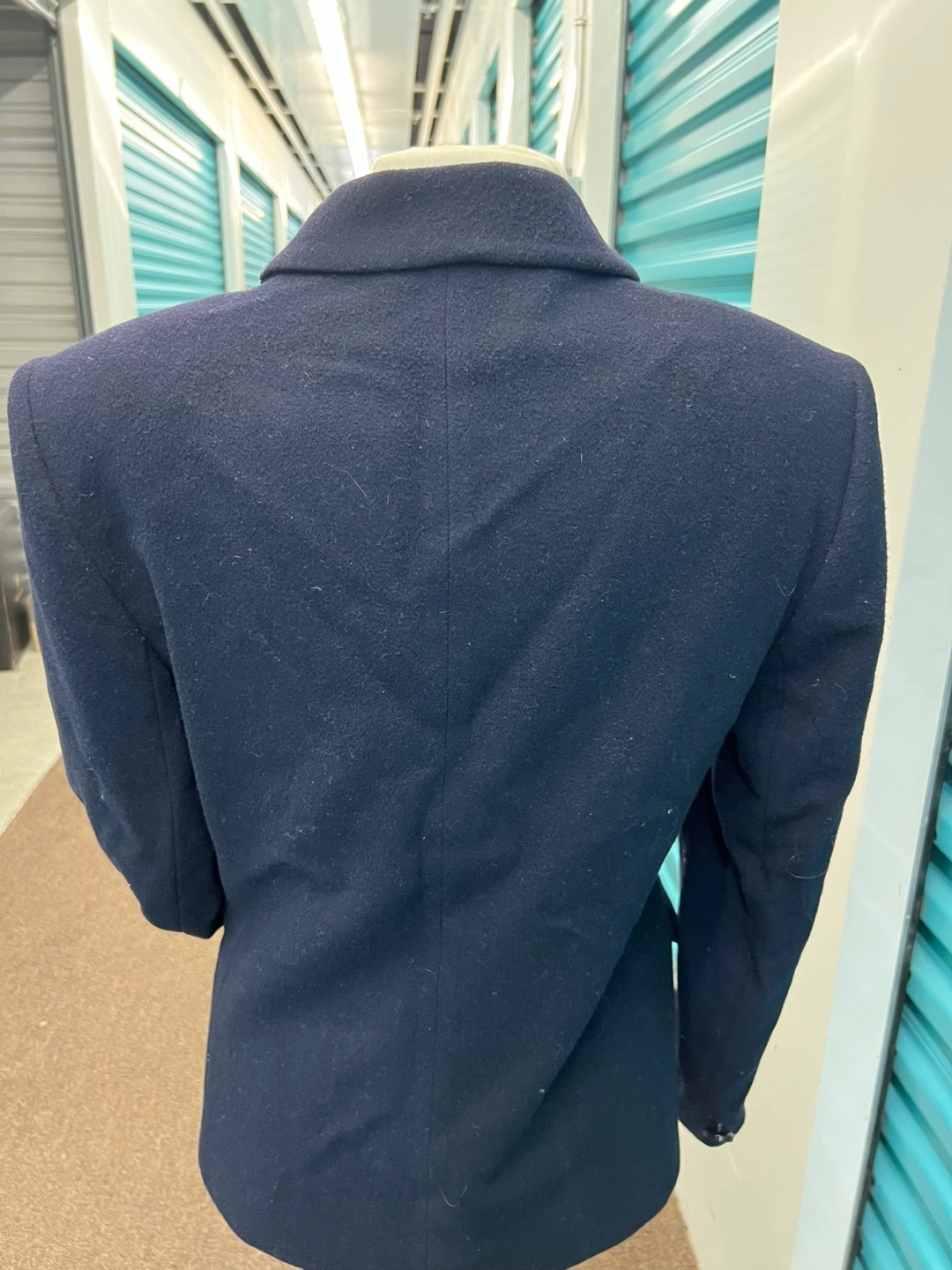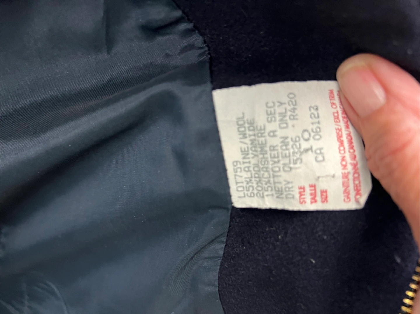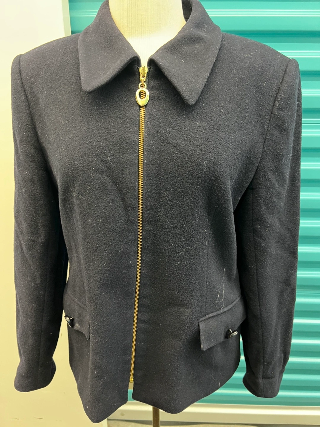 Here's a stylish navy blue wool jacket from D'OraK! It features a unique zipper pull and a classic design. Perfect for adding a touch of elegance to your wardrobe
