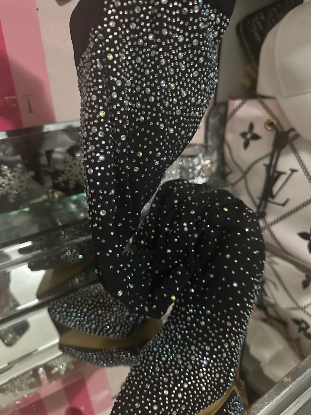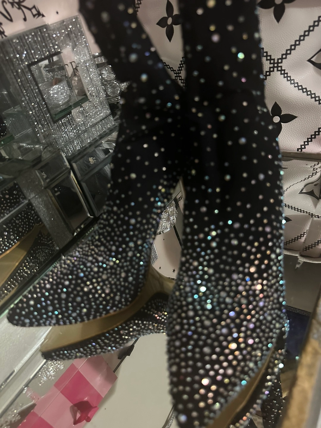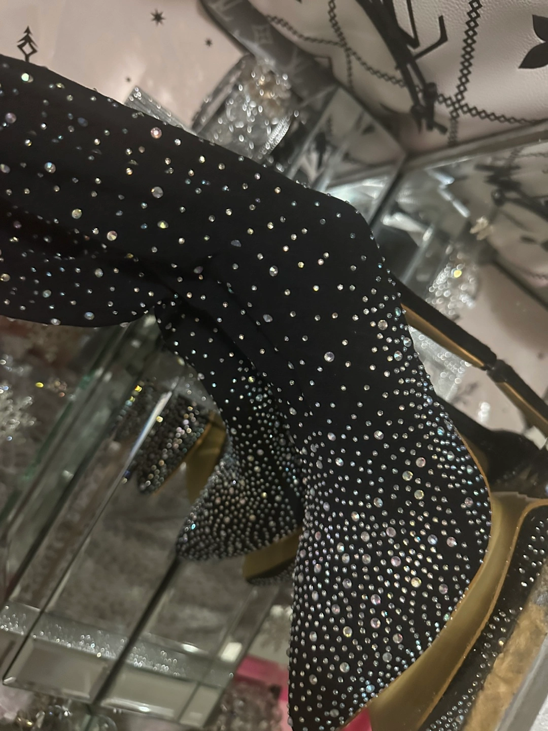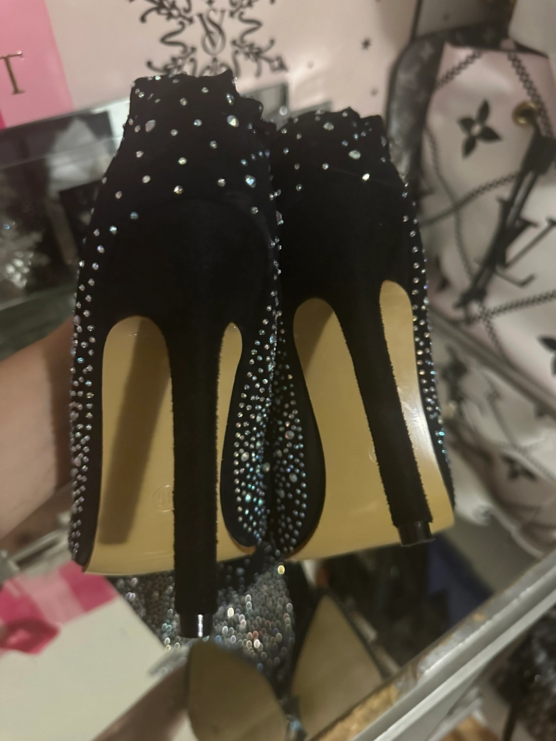 83These black heels are embellished with rhinestones all over. They are a size 40. They are in good condition and ready for a night out!