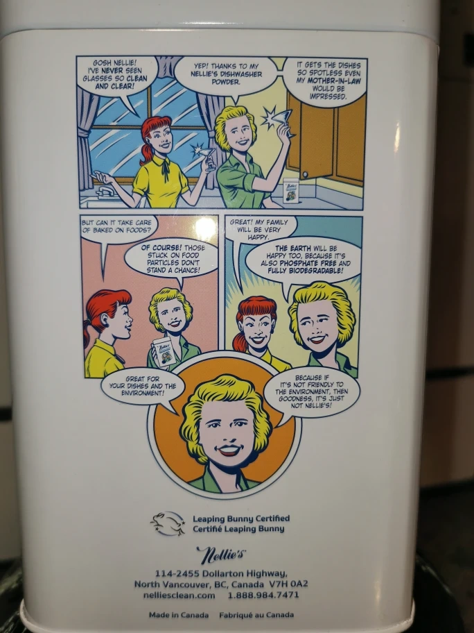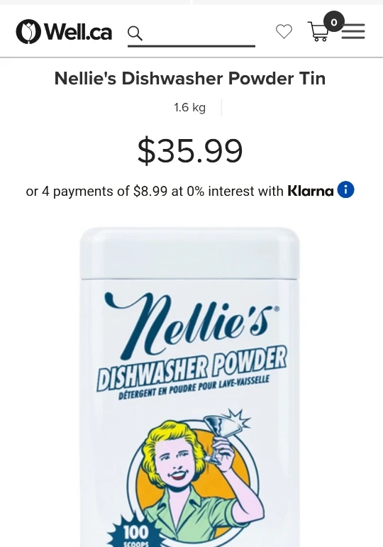 I'm selling a tin of Nellie's Dishwasher Powder. I paid $36+ tax. It contains 1.6 kg / 3.5 lb of detergent. (100 scoops!) Comes in a sturdy reusable tin.