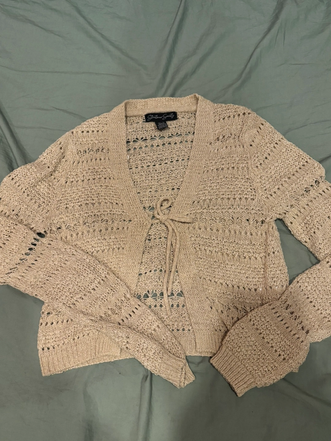 Selling a cute knit tie-front cardigan from Starlour Society! It's a lovely neutral colour and has a delicate knit pattern. Perfect for layering or wearing on its own during warmer weather