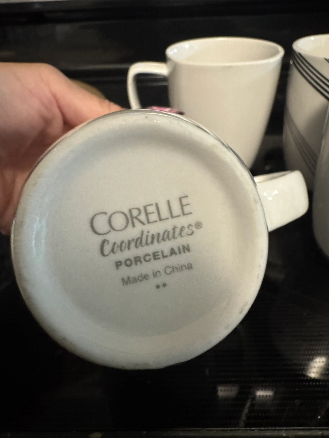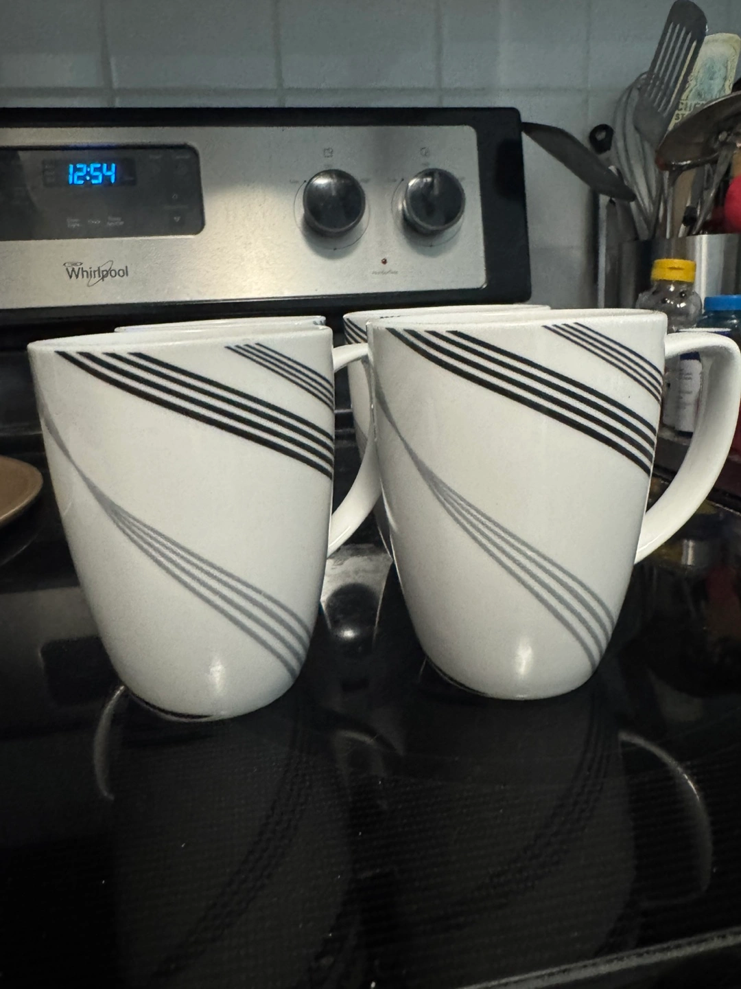 Selling a set of 4 Corelle Coordinates porcelain mugs! They have a stylish design with black and grey stripes. Perfect for your morning coffee or tea!