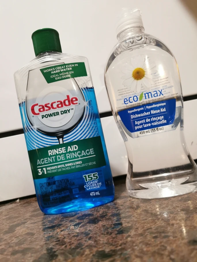 Brand new, unopened Eco Max, a natural, hypoallergenic rinse aid. And Cascade Power Dry, like 80% full.