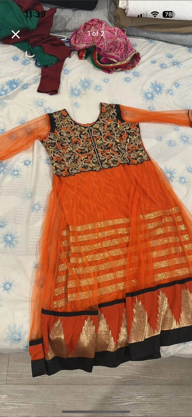 Beautiful orange and black kurta with intricate gold embroidery. Perfect for special occasions!