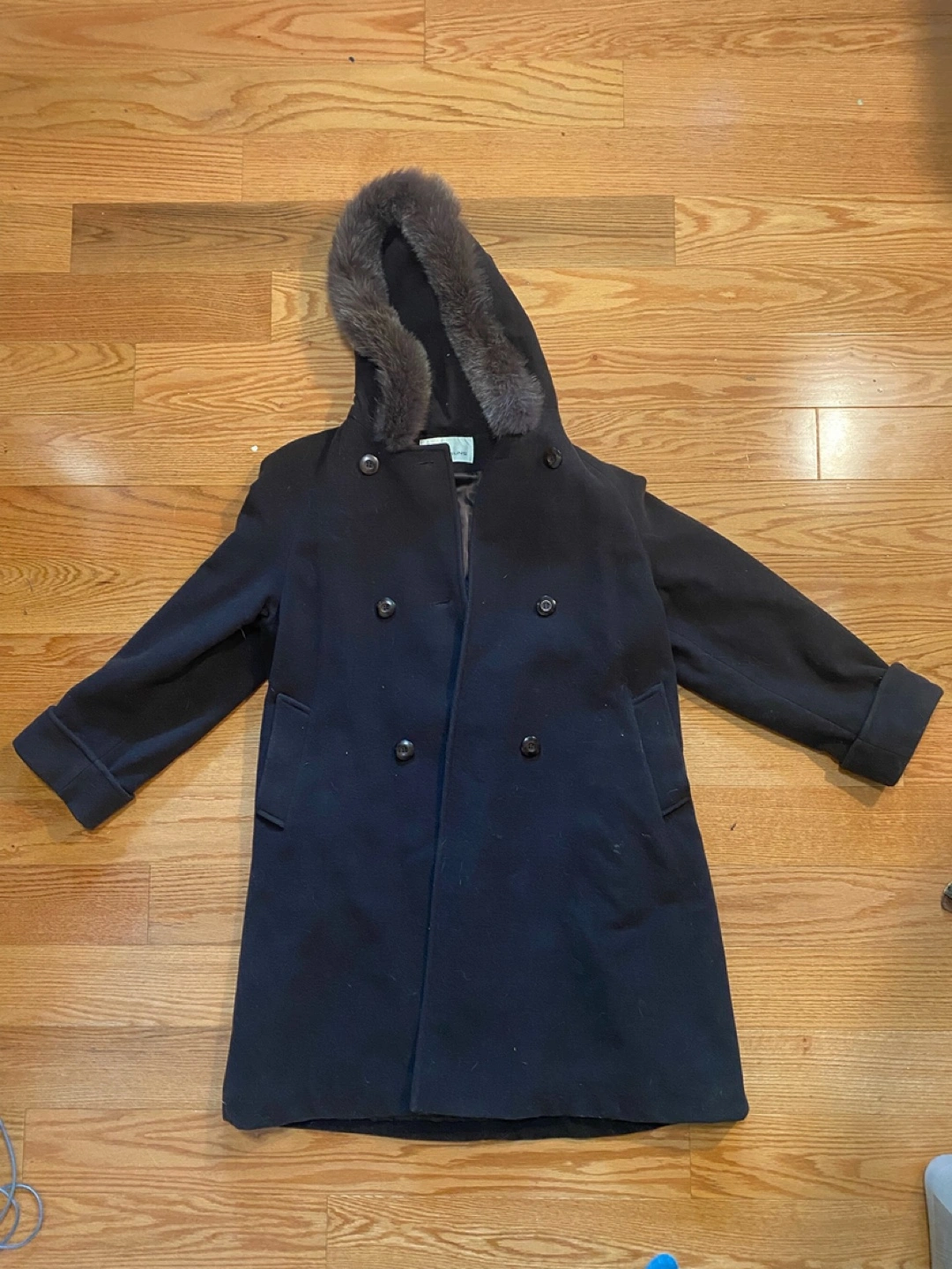 A stylish navy wool coat with a fur-trimmed hood! It's a double-breasted design and looks great for those chilly days
